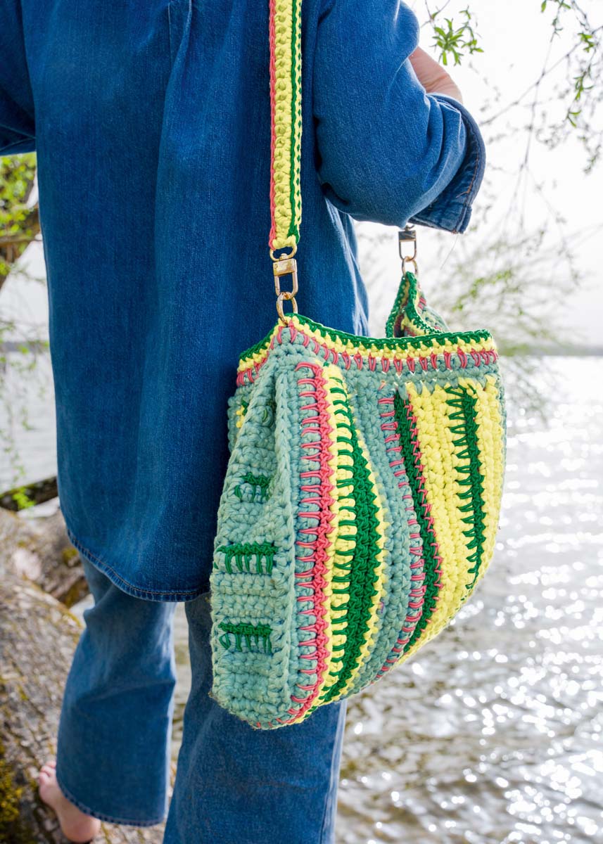 Lana Grossa The Paper (70% Polyester, 30% Viskose, Lauflänge 100 m/100 g), 100 g Zitrusgelb (Fb. 16) und 100 g Türkis (Fb. 9) und Lana Grossa The Core (50% Baumwolle, 50% Polyester, Lauflänge 85 m/100 g), 100 g Lachs (Fb. 18) und 100 g Grün (Fb. 23); 1 Häkelnadel Nr. 6, sowie 2 goldfarbene Taschenkarabiner und 2 goldfarbene Ringe zum Öffnen, Ø 28 mm.