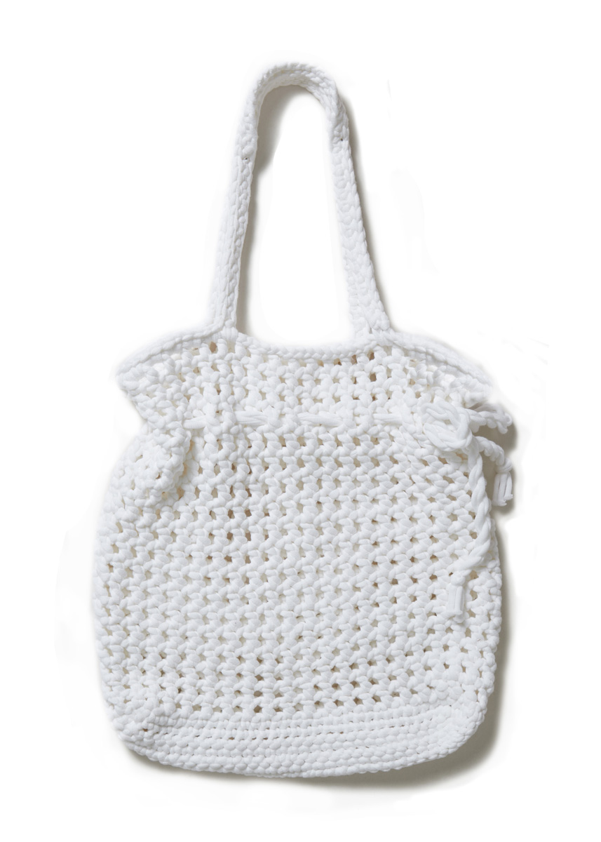 Beim weißen Filetmuster- Shopper kreiert mit Watte gefülltes Schlauchgarn einen beeindruckenden 3-D-Effekt. Das eingezogene Band verschließt die Tasche und verpasst dem coolen Modell etwas Feminines.
