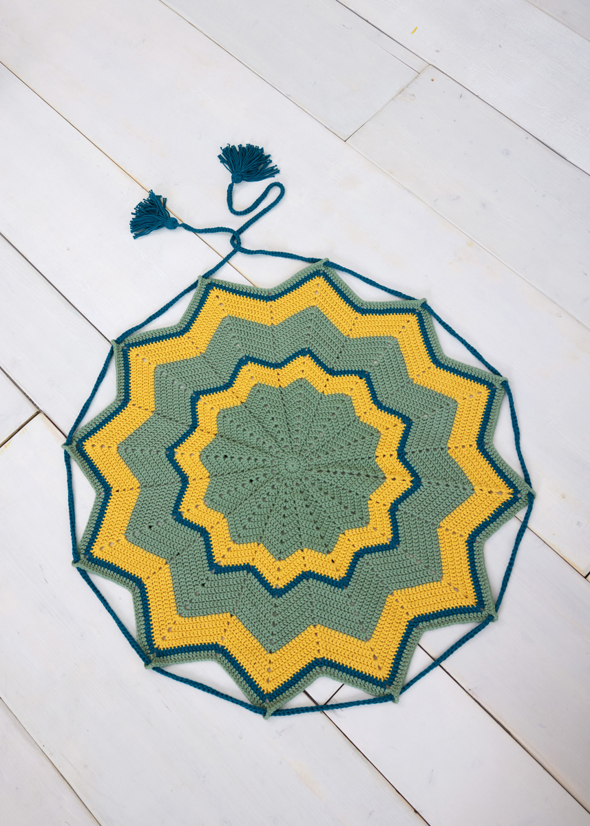 Lana Grossa-Qualität „The Tube Fine“ (68 % Baumwolle, 32 % Polyamid; Lauflänge = 140 m/100 g): 400 g Resedagrün (Fb 111) und 200 g Gelb (Fb 117) und 100 g Petrol (Fb 112); je eine Häkelnadel 5 mm und 10 mm.