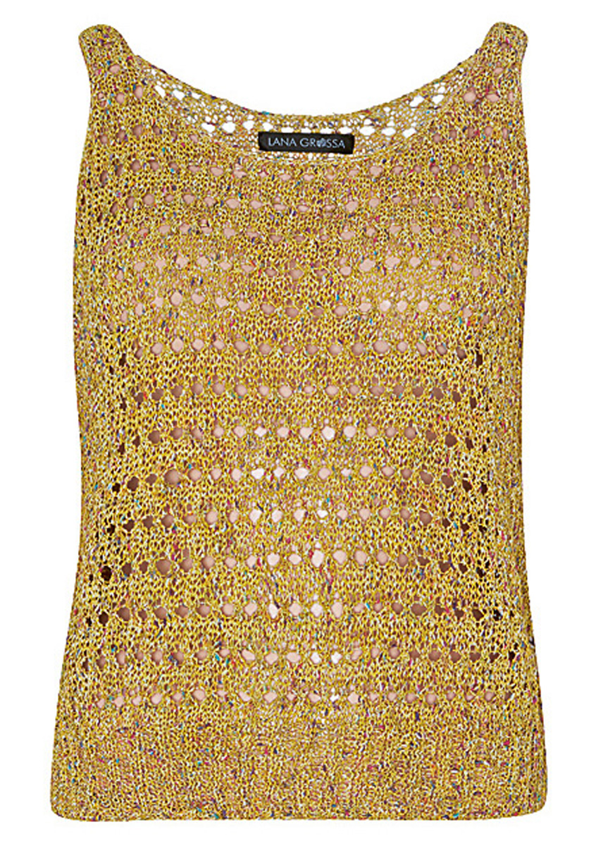 Lana Grossa-Qualität „About Berlin Spotty“ (55 % Baumwolle, 26 % Polyamid, 19 % Polyester, Lauflänge 125 m/50 g): ca. 250 (300) g Senfgelb bunt (Fb. 3); Stricknadeln Nr. 3 und 4, 1 Rundstricknadel Nr. 4, 50 cm lang.