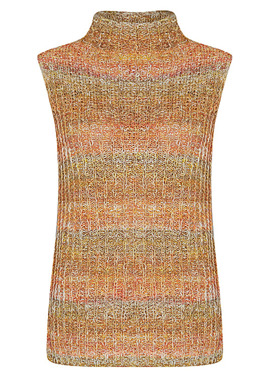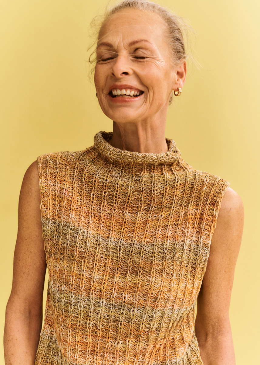 Lana Grossa-Qualität „About Berlin Vanity“ (54 % Baumwolle, 21 % Viskose, 13 % Seide, 12 % Polyamid, Lauflänge 100 m/50 g): ca. 300 (350 – 400) g Zimt/Ocker/Oliv bunt (Fb. 3); Stricknadeln Nr. 3,5 und 4, 1 Rundstricknadel Nr. 3,5, 40 cm lang.