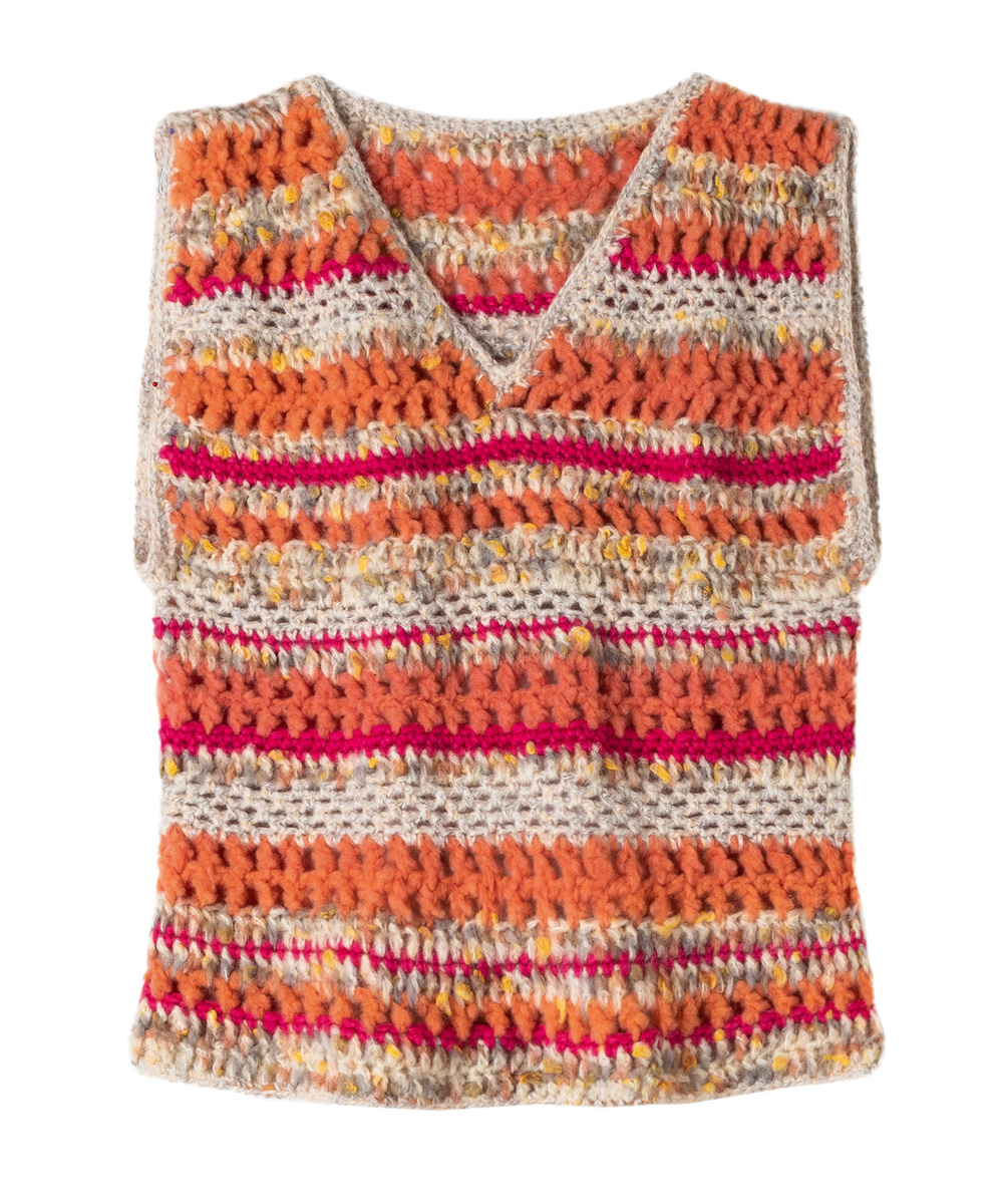 Lana Grossa Lala Berlin Brushy Print (40% Schurwolle (Merino), 36% Mohair (Superkid), 13% Polyamid, 11% Baumwolle, Lauflänge 115 m/50 g), 100 (150 – 150) g Zartgelb/Gelb/Lachs/Grau/Graubraun (Fb 203), Lana Grossa Lala Berlin Cloudy (93% Schurwolle (Merino extrafine), 7% Nylon, Lauflänge 100 m/50 g), 100 (150 – 150) g Lachs (Fb 3), Lana Grossa Lala Berlin Lovely Cotton (75% Schurwolle (Merino superfine), 25% Baumwolle, Lauflänge 90 m/50 g), 50 g Pink (Fb 28) und Lana Grossa Sara (65% Baumwolle, 30% Alpaka (Baby), 5% Schurwolle (Merino), Lauflänge 125 m/50 g), 50 g Beige/Goldgelb meliert (Fb 19); 1 Häkelnadel Nr. 5 und 6.