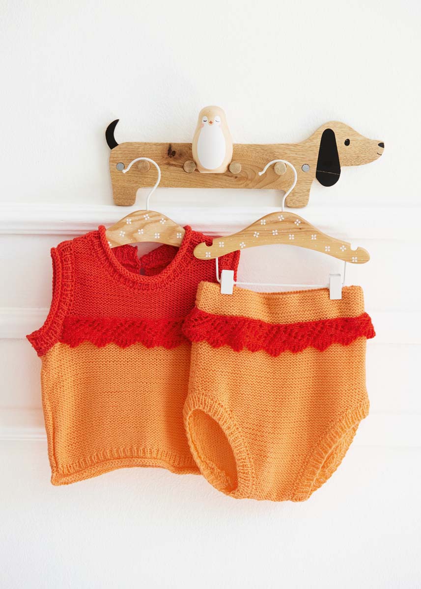 Lana Grossa Campo (65% Baumwolle, 25% Viskose, 10% Leinen; LL = 165 m/50 g): 50 (50/100/100) g Orange (Fb. 14) und 50 g Leuchtendrot (Fb. 16); Lana Grossa Sottile (85% Baumwolle, 15% Schurwolle (Merino); LL = 250 m/50 g): 50 g Leuchtendrot (Fb. 4); je eine Rundstricknadel 3,5 mm und 4 mm; Häkelnadel 3 mm; Maschenmarkierer; 1 Knopf mit 13 mm Ø.