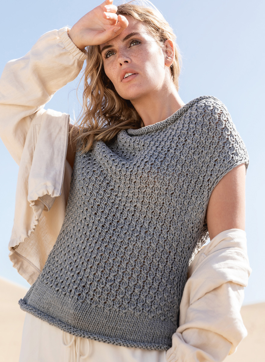 Lana Grossa-Qualität „Certo” (100 % GOTS Baumwolle, LL = ca. 115 m/50 g): ca. 300 (350) g Betongrau (Fb. 12); Stricknadeln Nr. 7 und 8.