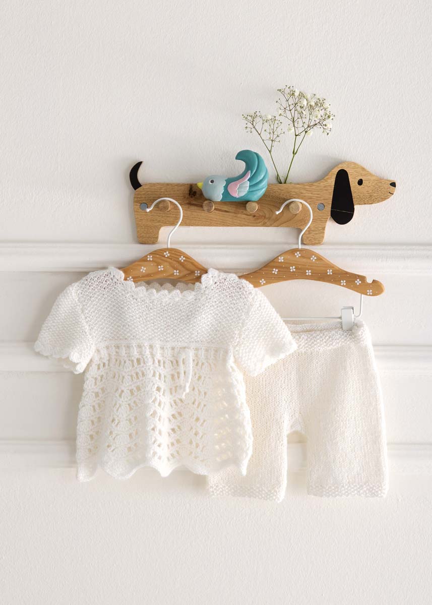 Lana Grossa Cool Wool Baby (100% Schurwolle (Merino extrafine); LL = 220 m/50 g): 100 (100/150/150) g Weiß (Fb. 207); eine Rundstricknadel 3 mm; eine Häkelnadel 3 mm; 2 Knöpfe mit 9 mm Ø.