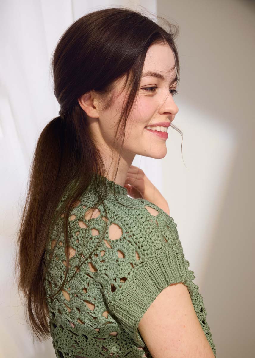 Lana Grossa Cotton Silk (70% Baumwolle, 30% Seide, Lauflänge 140 m/50 g), 350 (450 – 550) g Hellgrün (Fb. 15); je 1 Rundstricknadel Nr. 3,5, 40 und 80 cm lang, sowie 1 Häkelnadel Nr. 4,5.