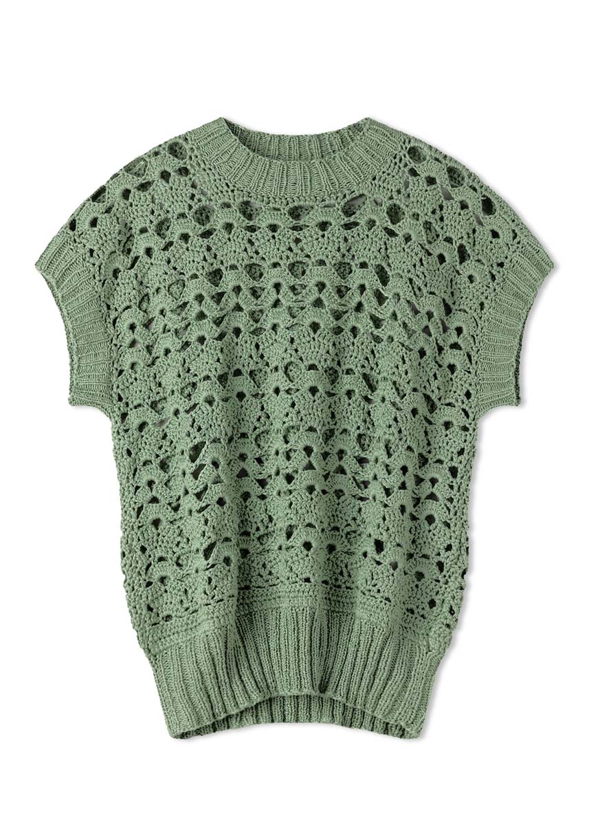 Gehäkeltes Ajourmuster und gestrickte Bündchen vereinen sich in dem ärmellosen Top zum modischen Statement.