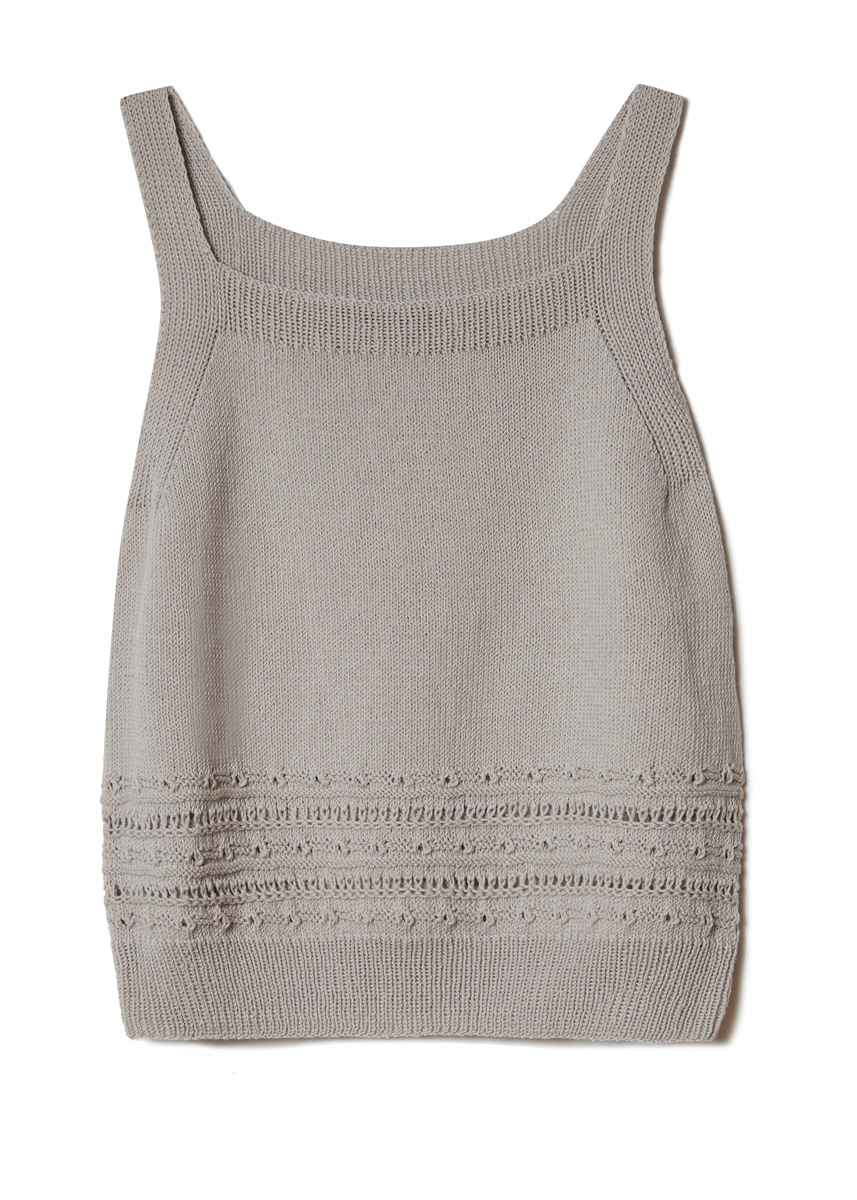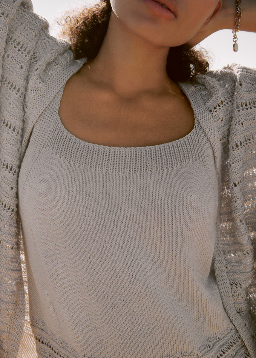 Entspannt statt steif – so sieht das neue Twinset aus. Basis hier ist ein Top in leichter Trapezform und mit Karree-Dekolletees in Vorder- und Rückenteil. Die angestrickten Hebemaschen-Träger verschmelzen mit den Ausschnittblenden und kreieren so einen schlichten, hochwertigen Look. Den Saum betonen zweierlei Lochmuster, die in der schenkellangen Jacke wieder aufgegriffen werden.