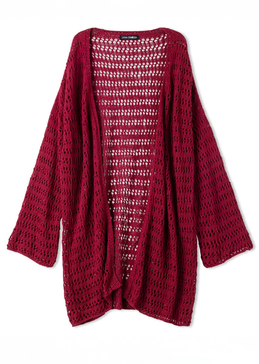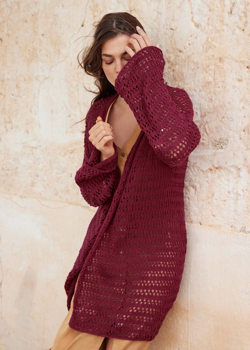 Dieser Lochmuster-Cardigan wird top-down, also nahtlos und von oben nach unten gestrickt. Eleganz kommt über die lange, schlichte Silhouette und den angesagten Burgunderton.