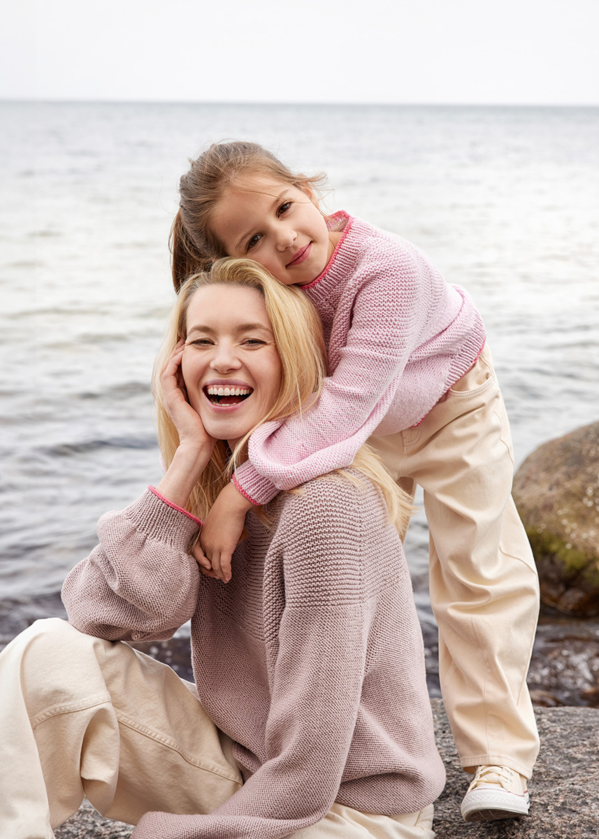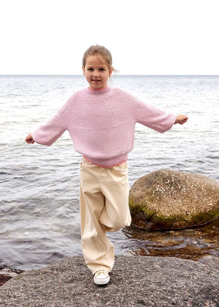 Der Pulli wird am Halsausschnitt begonnen und von oben nach unten in Runden an einem Stück gestrickt.