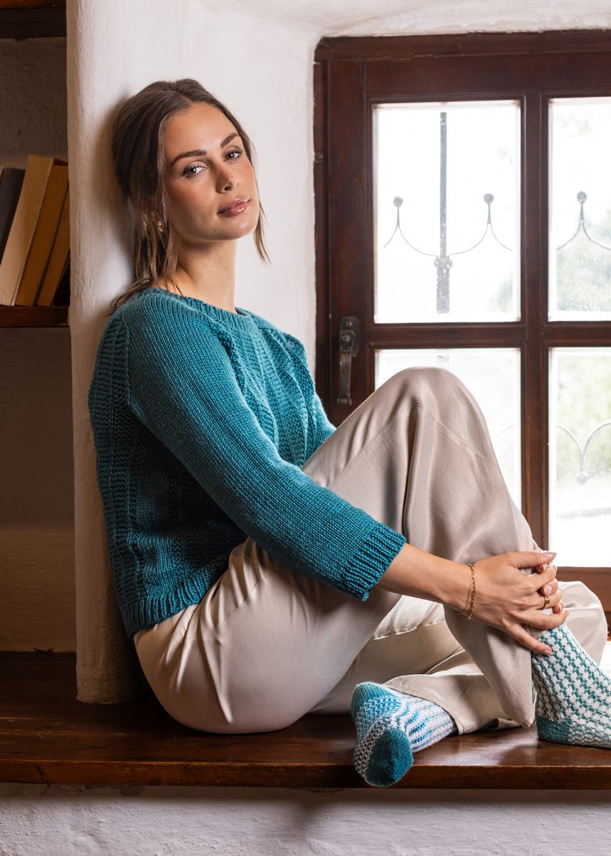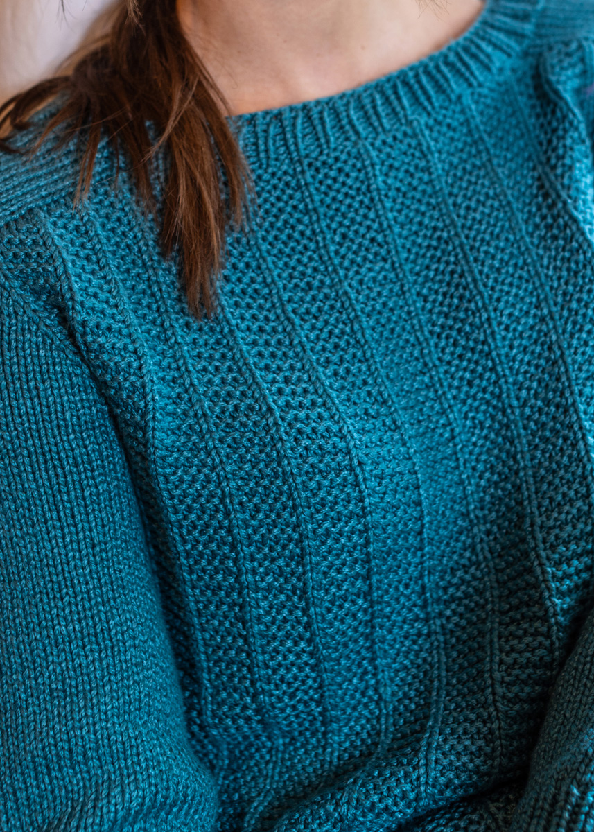 Der Pullover wird nahtlos in einem Stück von oben nach unten gestrickt und hat eine Gesamtlänge von 52 (54 - 56 - 58 - 60 - 62) cm und eine Brustmehrweite von 7 cm bei 80 cm Brustumfang (8 cm bei 88 cm Brustumfang - 8 cm bei 96 cm Brustumfang - 9 cm bei 104 cm Brustumfang - 8 cm bei 116 cm Brustumfang - 8 cm bei 128 cm Brustumfang)