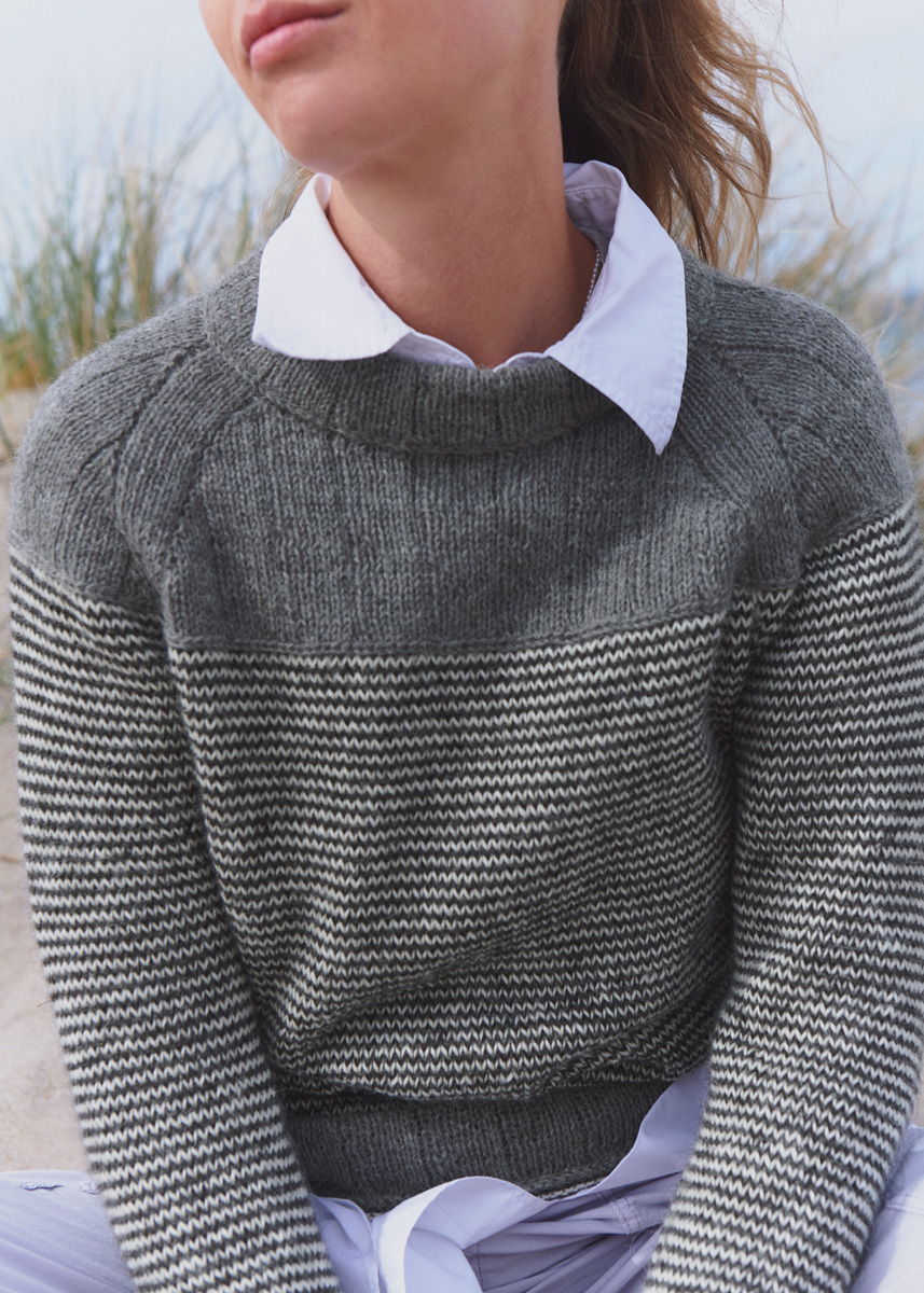 Ein doppelt gearbeiteter Halsausschnitt, Ringel in Spiraltechnik, das Ganze top-down gestrickt: Dieser Pullover ist wunderschön – und perfekt, wenn Sie eine Herausforderung suchen.