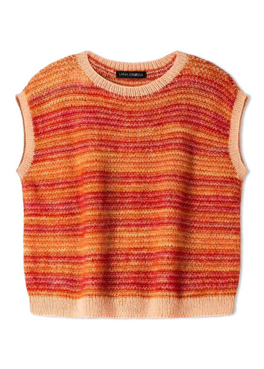 Lana Grossa „Ecopuno“ (72% Baumwolle, 17% Schurwolle (Merino), 11% Alpaka (Baby), Lauflänge 215 m/50 g), 100 (150 - 150) g in Apricot (Fb. 99) und Lana Grossa „Cottonhair“ (70% Mohair (Superkid), 30% Baumwolle, Lauflänge 450 m/50 g), 50 (100 - 100) g in Hummer/Orange/Hellorange/Pink/Fuchsia/Rost (Fb. 101); Stricknadeln Nr. 3,5 und Nr. 4,5, 1 Rundstricknadel Nr. 3,5, 40 cm lang.