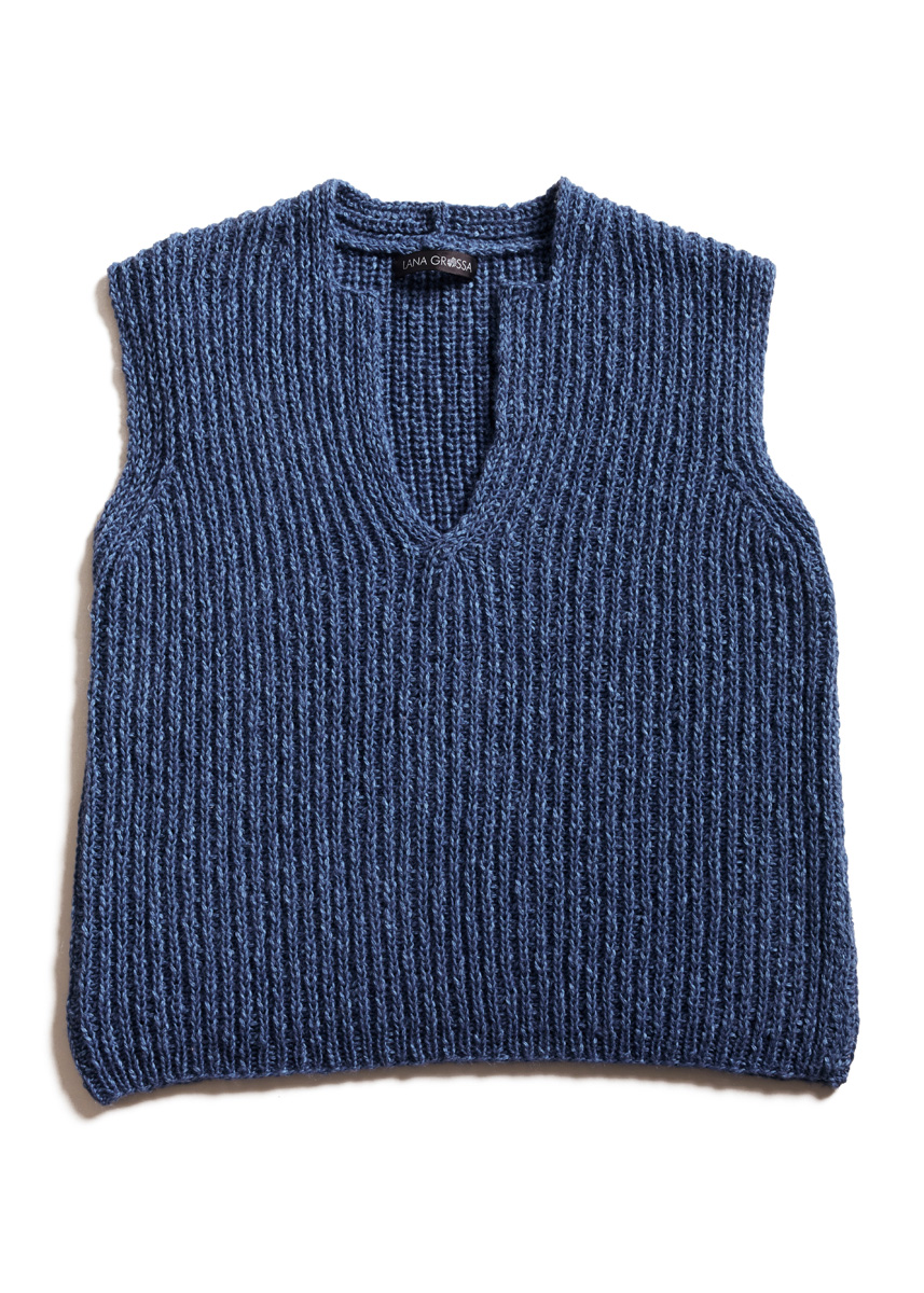 Das blaue Top wurde aus einem neuen, melierten Garn im Halbpatent gestrickt. Betonte Abnahmen an Schultern und Ausschnitt verleihen ihm Raffinesse.
