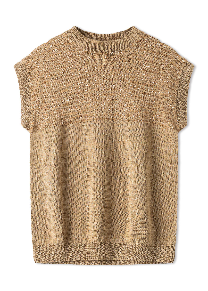 Lana Grossa-Qualität „Filo Lurex“ (94 % Baumwolle, 6 % Polyester, LL = ca 145 m/50 g): 250 (300 - 300 - 350) g Camel (Fb 17); Lana Grossa-Qualität „Glamour“ (55 % Polyamid, 45 % Polyester, LL = ca 115 m/25 g): 50 (50 - 50 - 50) g Camel (Fb 11); Stricknadeln Nr 3 und Nr 3,5; kurze Rundstricknadel Nr 3.