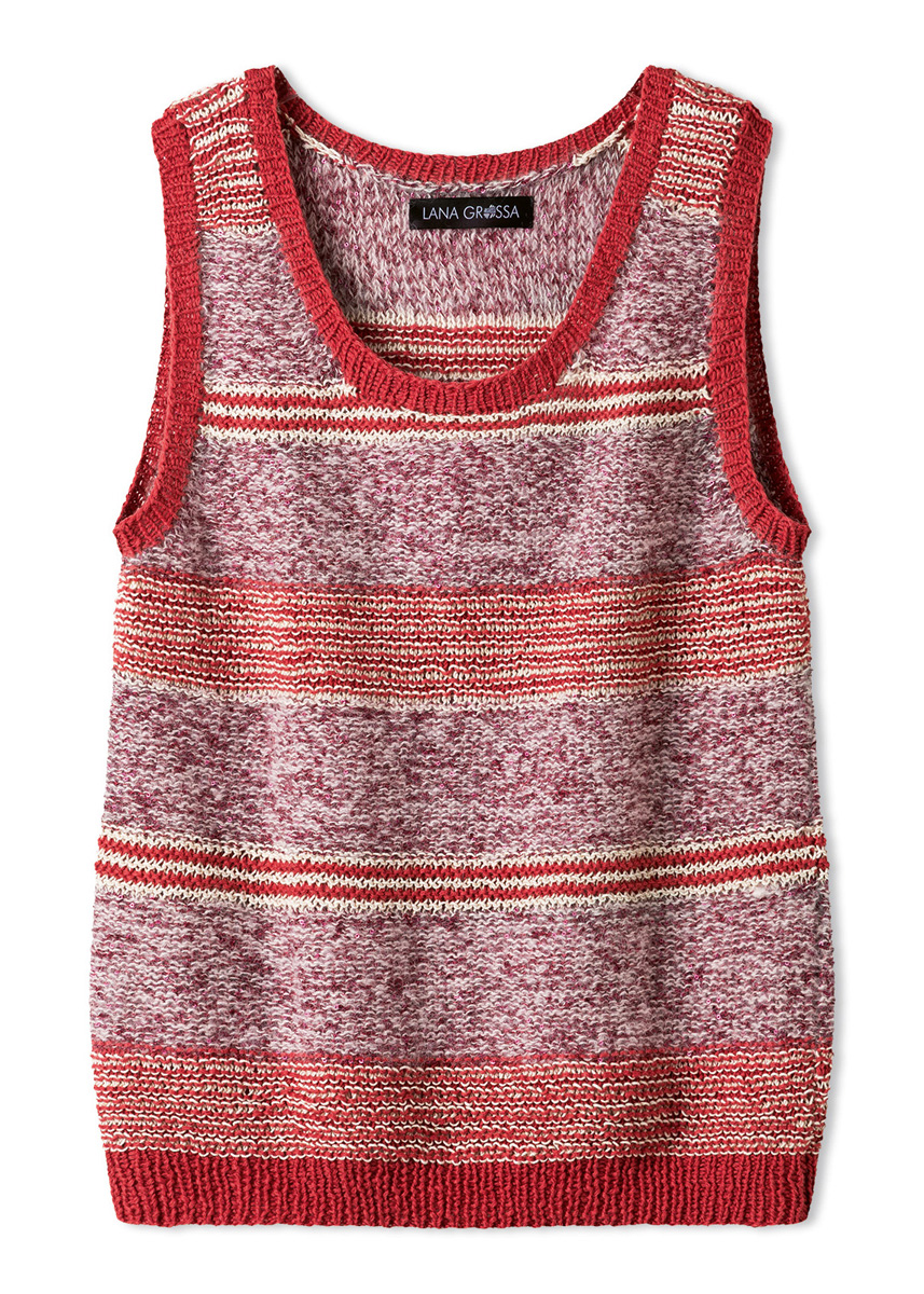 Lana Grossa-Qualität „Summer Cashmere“ (90 % Baumwolle, 10 % Kaschmir, LL = ca 210 m/50 g): ca 50 (100 - 100 - 150) g Orientrot (Fb 25); Lana Grossa-Qualität „Setasuri“ (69 % Alpaka (Suri), 31 % Seide, LL = ca 212 m/25 g): ca 50 (50 - 75 - 75) g Creme (Fb 2); Lana Grossa- Qualität „Filo Lurex“ (94 % Baumwolle, 6 % Polyester, LL = ca 145 m/50): ca 50 (50 - 100 - 100) g Creme (Fb 2); Lana Grossa-Qualität „Glamour“ (55 % Polyamid, 45 % Polyester, LL = ca 115 m/25 g): ca 50 (75 - 75 - 100) g Bordeaux (Fb 9); Stricknadeln Nr 3 und Nr 4; 1 kurze Rundstricknadel Nr 3.