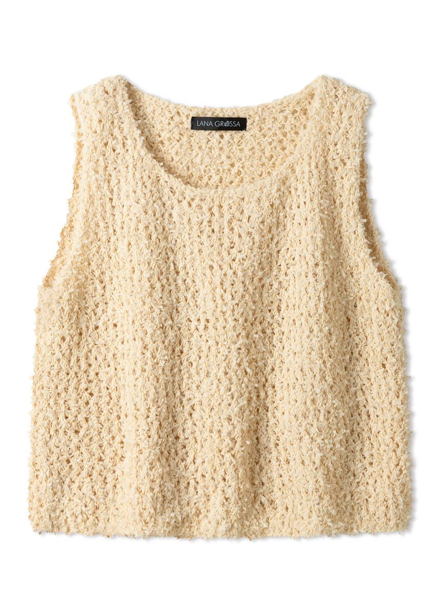 Lana Grossa-Qualität „Frizzante“ (54 % Baumwolle, 46 % Polyamid, LL = ca 105 m/50 g): ca 200 (200 - 250 - 250) g Creme (Fb 1); Stricknadeln Nr 5; Häkelnadel Nr 5.
