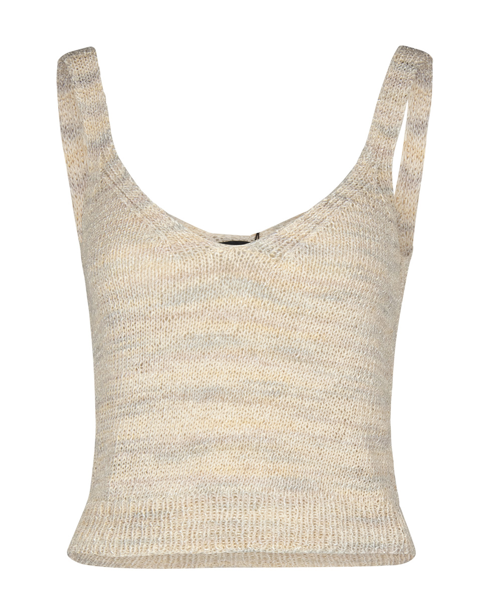 Einfach (aber) umwerfend ist dieses tief dekolletierte Top mit zeitlosen Ton-in-Ton-Schattierungen. Hübsche Randerscheinung: Betonte Abnahmen an Achseln und Ausschnitt, die sich in den Trägern treffen.