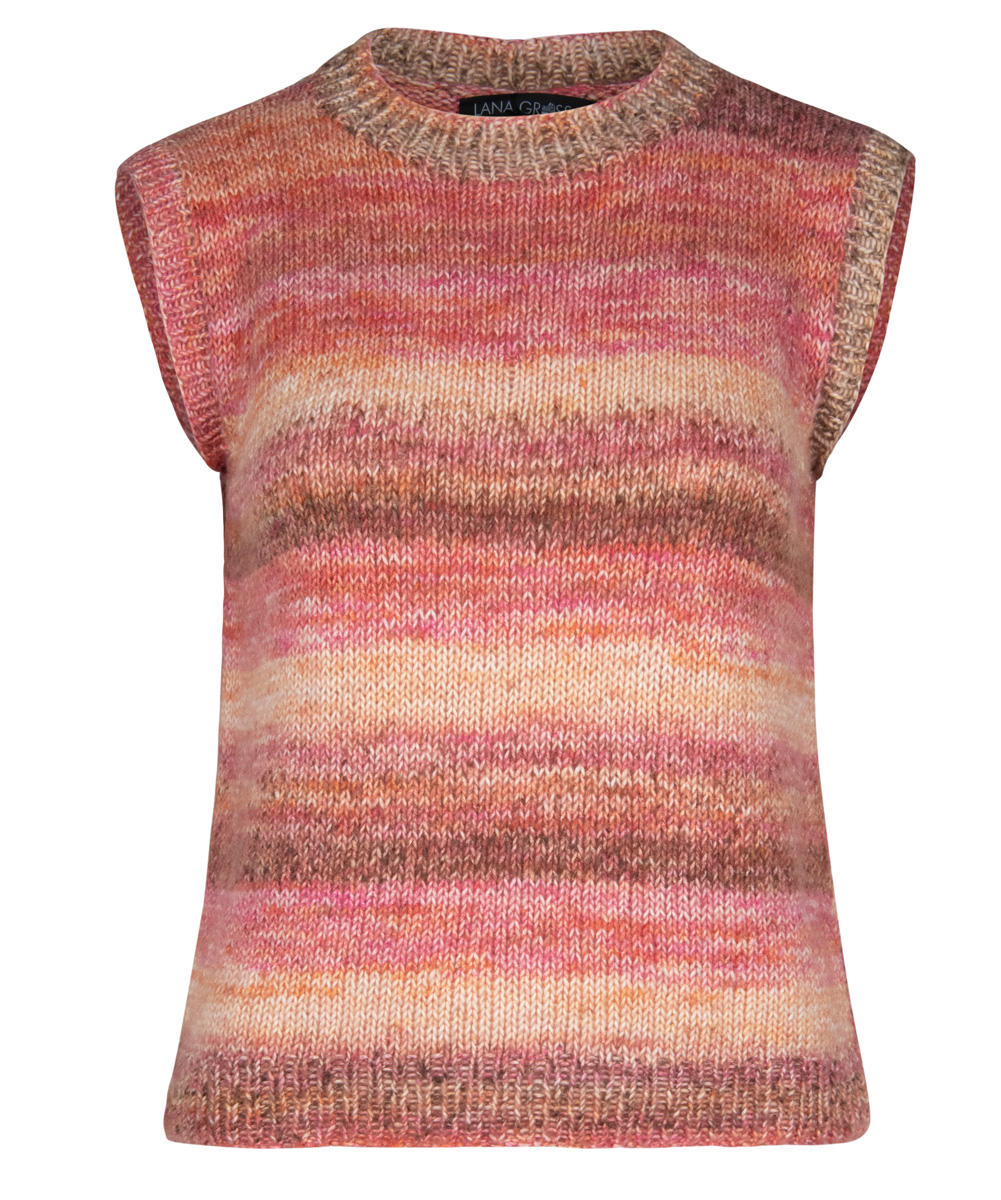 Lana Grossa-Qualität „Tropico” (70 % Baumwolle, 30 % Schurwolle (Merino), LL = ca. 125 m/50 g): ca. 250 (300 – 350) g Pink/Rosa/Mandarin/Weiß/Lachs (Fb. 2); Stricknadeln Nr. 4 und 5, 1 Rundstricknadel Nr. 4, 40 cm lang.