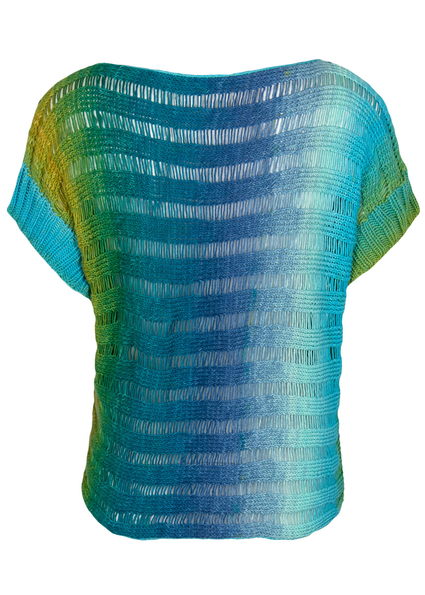 Lana Grossa Gomitolo Aloha (50 % Baumwolle, 50 % Viskose, Lauflänge 250 m/100 g), 300 (300 – 400) g Türkis/Blau/Smaragd/Apfelgrün/ Gelboliv/Himmelblau (Fb 304); Stricknadeln Nr. 4,5, 1 Rundstricknadel Nr. 4,5, 40 cm lang, 1 Spiel Stricknadeln Nr. 4,5.