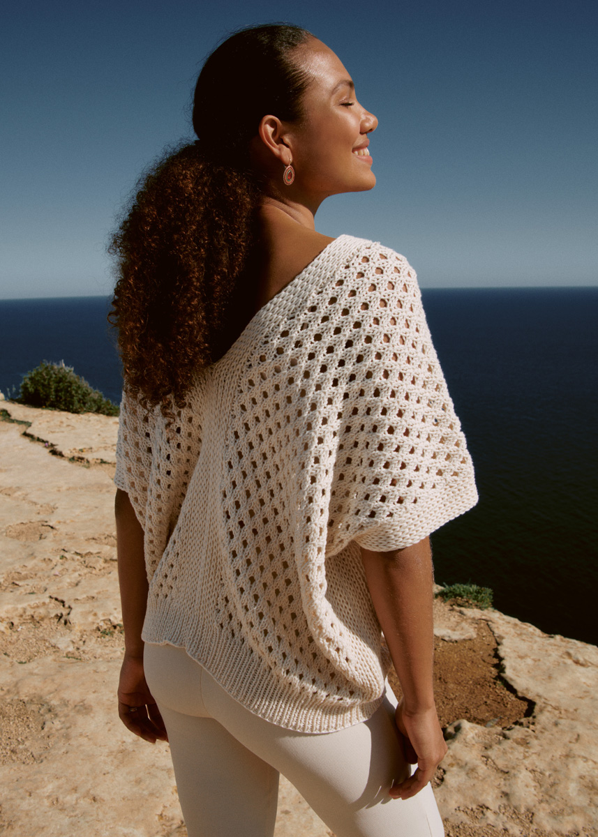 Easy Chic: Das Lochmuster-Top mit Hebemaschenblenden besteht aus zwei simplen Schals, die jeweils in der vorderen und hinteren Mitte verbunden werden. Der V-Neck ergibt sich, ganz ohne Abnahmen, einfach beim Zusammennähen.
