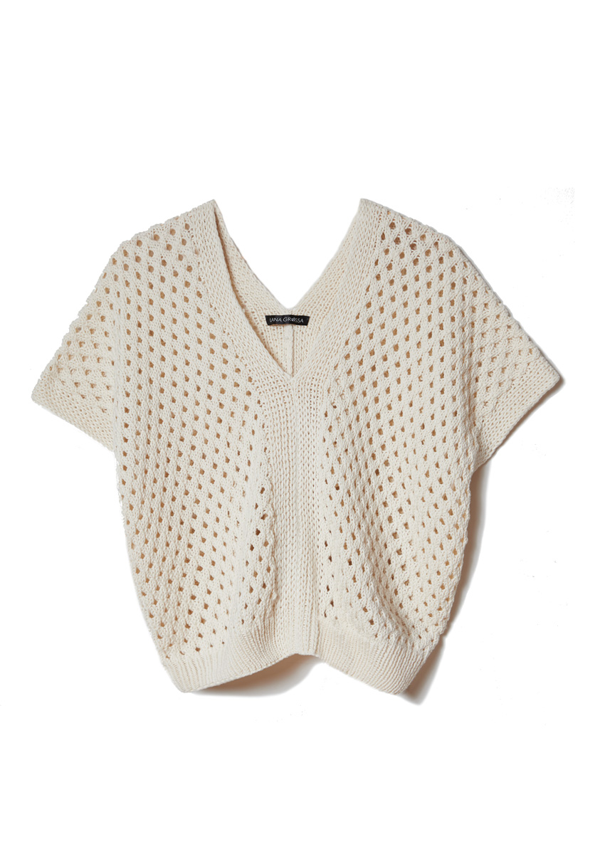 Lana Grossa-Qualität „Organico” (100 % (Bio) Baumwolle, LL = ca. 90 m/50 g): ca. 450 g Ecru (Fb. 6); Stricknadeln Nr. 3 und 5.