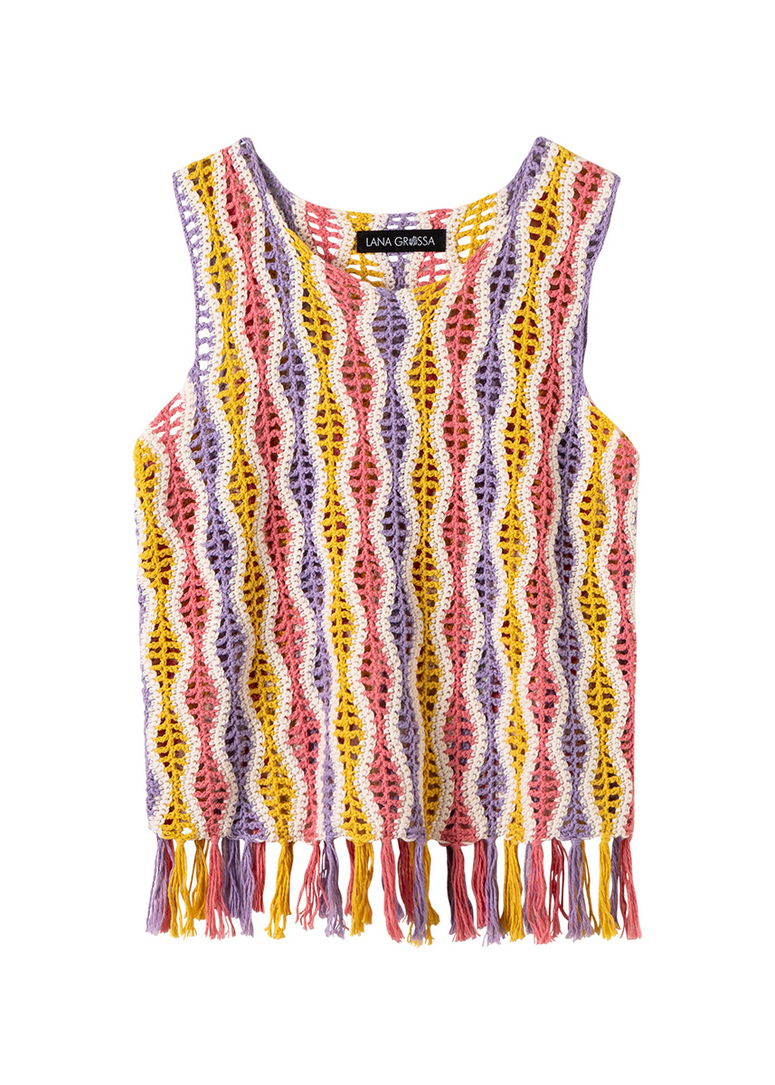 Quergehäkeltes Top in mehrfarbigem Wellenmuster mit nachträglich eingeknüpften Fransen.
