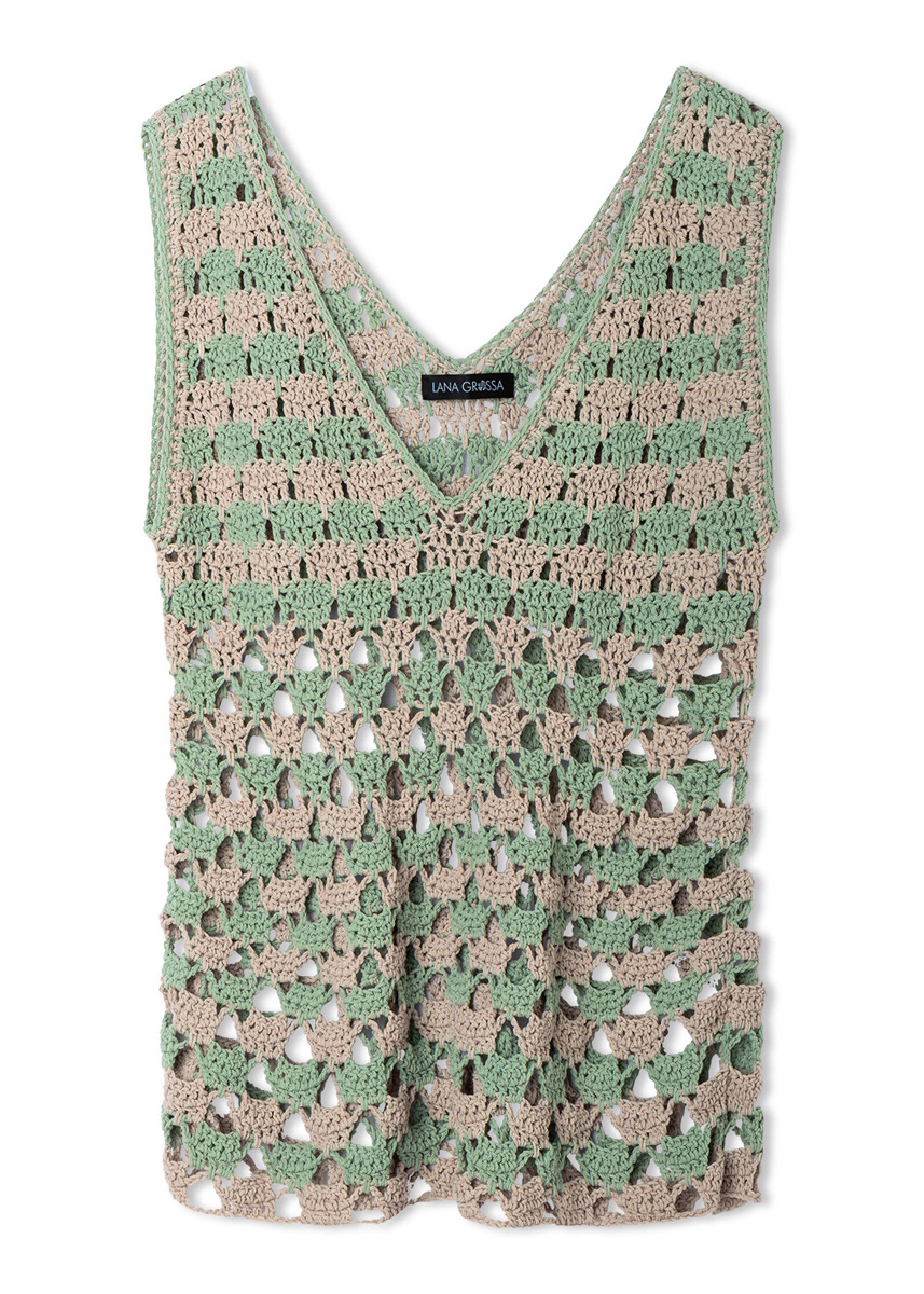 Lana Grossa-Qualität „Gioia” (75 % Baumwolle, 25 % rec. Polyamid, LL = ca. 110 m/50 g): ca. 200 g Beige (Fb. 16) und ca. 150 g Salbeigrün (Fb. 15); 1 Wollhäkelnadel Nr. 4.