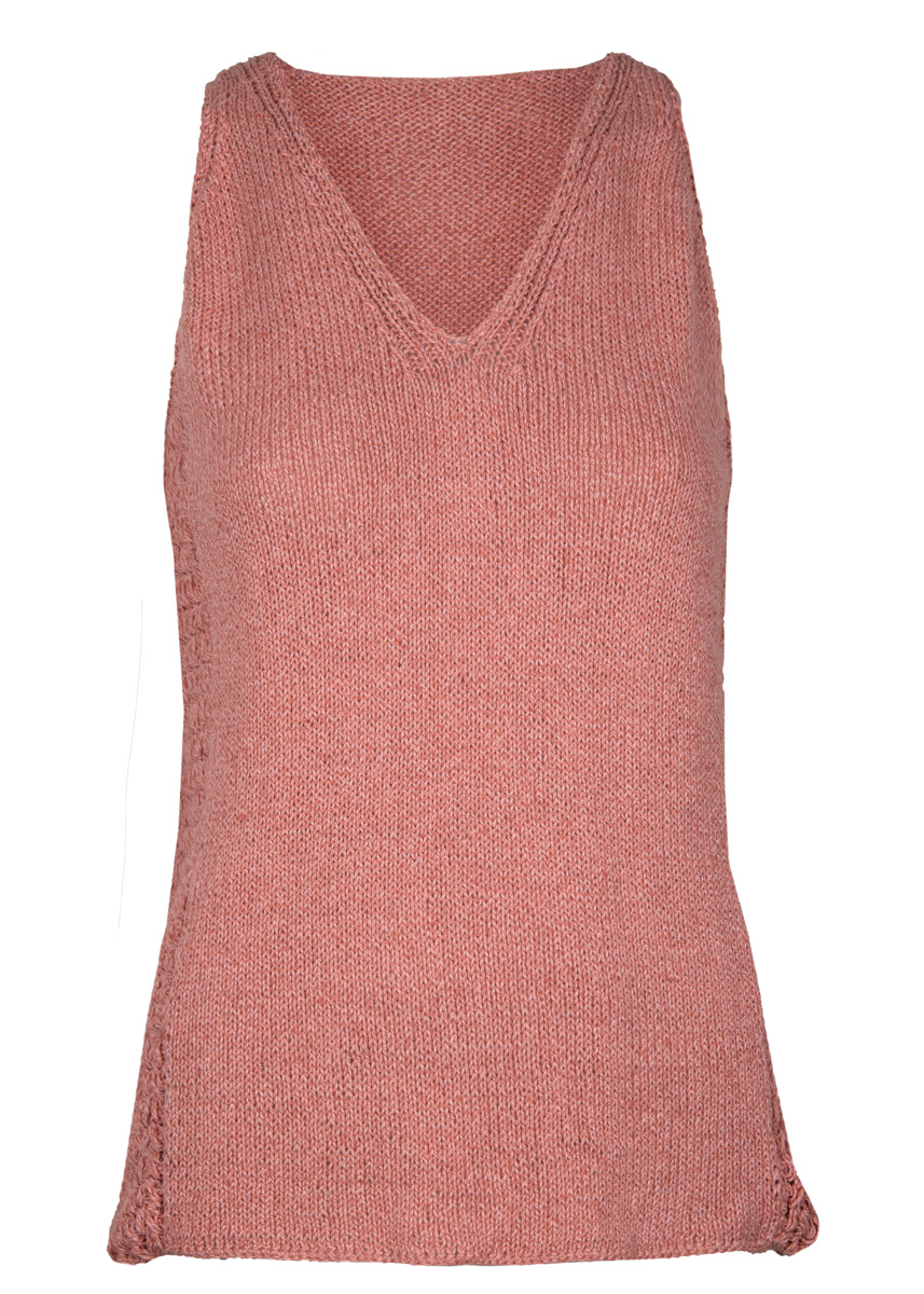 Lana Grossa Landlust Sommerseide (50% Seide, 50% Baumwolle, Lauflänge 170 m/50 g), 250 (300 – 350) g Lachsrosa (Fb 13); Stricknadeln Nr. 4 und 1 Häkelnadel Nr. 3,5.