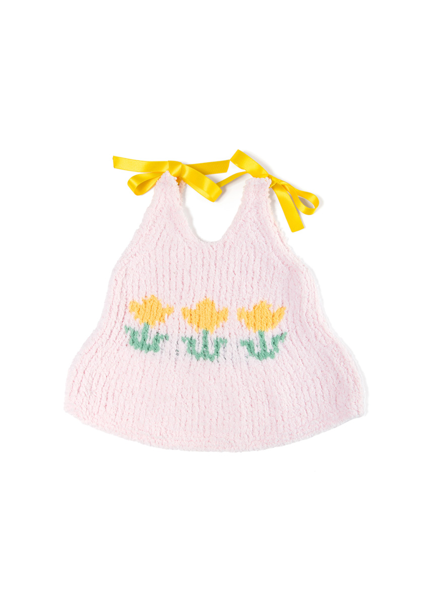Lana Grossa Leggerissimo (100% rec. Polyamid); LL = 150m/50 g): 50 (50/50/100) g Blassrosa (Fb. 7) und je 50 g und Mintgrün (Fb. 11) und Gelb (Fb. 1); je eine Rundstricknadel 4 mm und 4,5 mm; Maschenmarkierer; 110 cm gelbes Satinband, 1,5 cm breit.