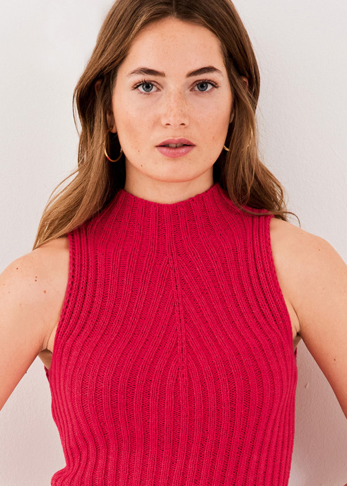 Lana Grossa Linarte (40% Viskose, 30% Baumwolle, 20% Leinen, 10% Polyamid, Lauflänge 125 m/50 g), 300 (350 – 400) g Rot (Fb 315); Stricknadeln Nr. 4 und je 1 Rundstricknadel Nr. 4, 40 und 80 cm lang.