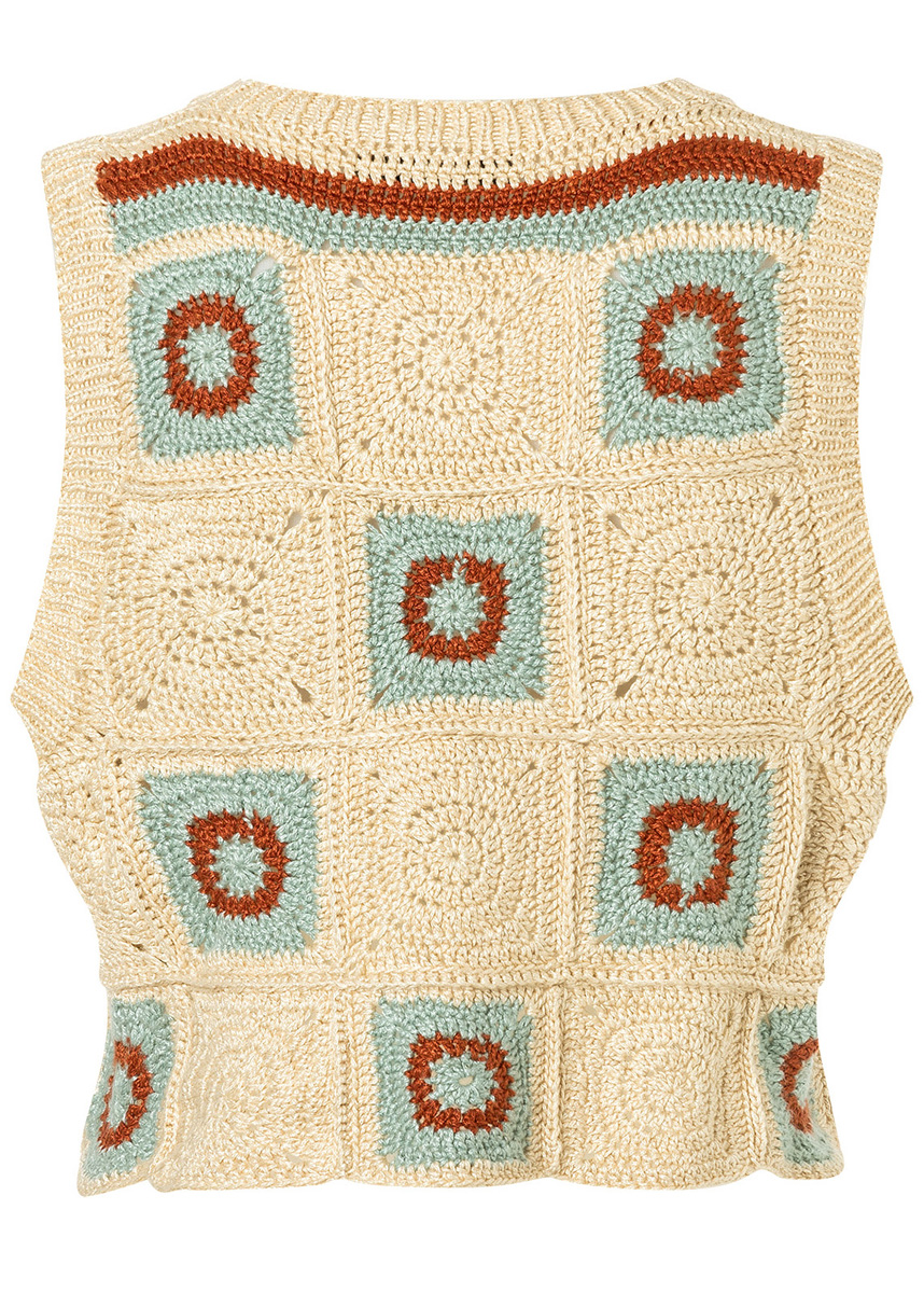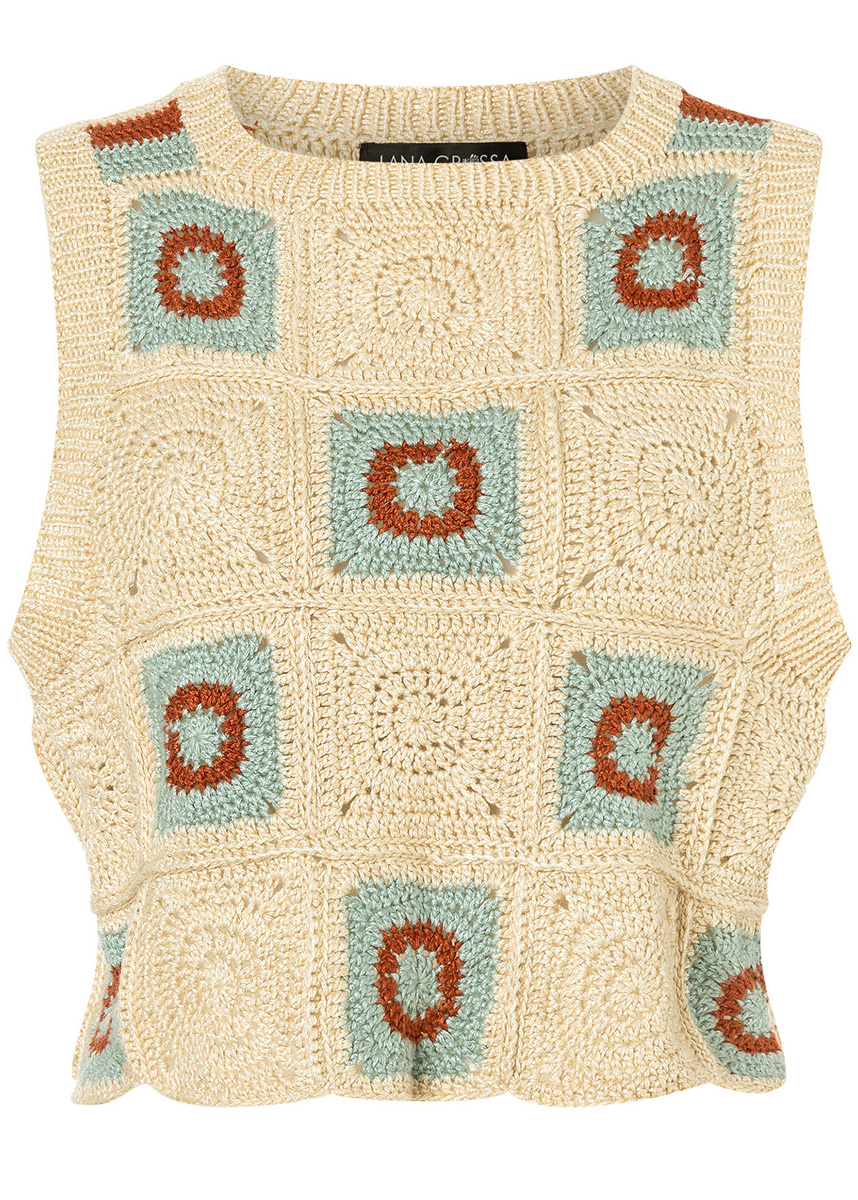 Dieses Hippie-Top punktet mit zeitgemäßen Details (tiefe Armlöcher, halsnaher Ausschnitt) und mit nostalgischen Granny-Squares, die mal uni, mal dreifarbig ausfallen.