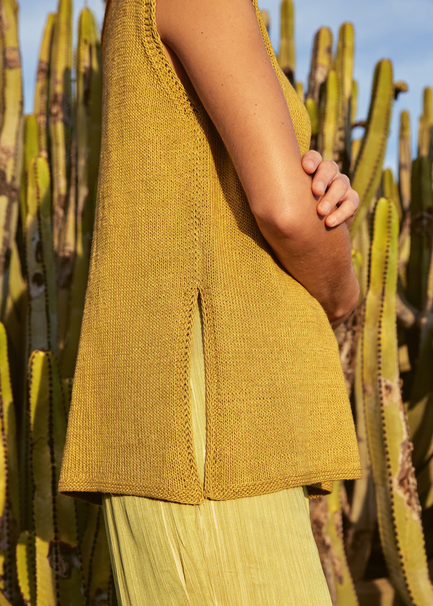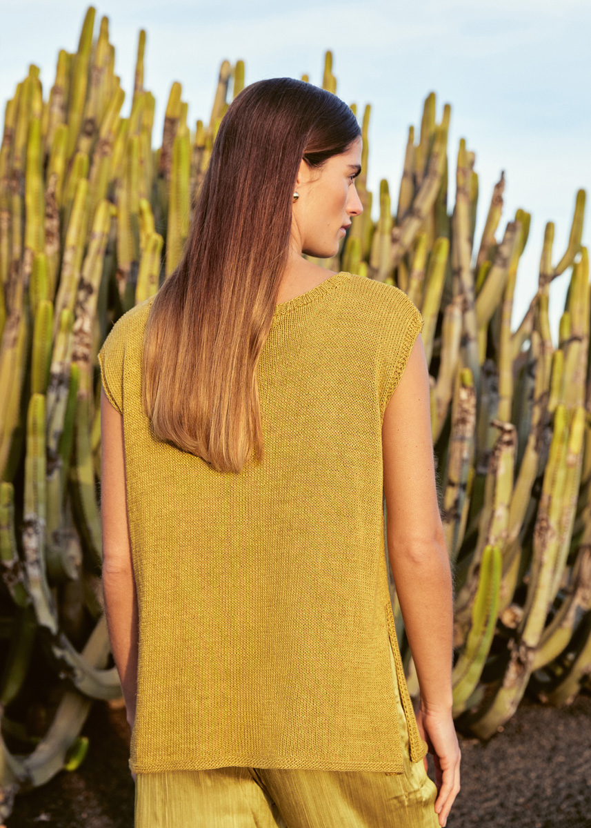 Lana Grossa-Qualität „Solo Lino” (80 % rec. Leinen (Viskose), 20 % Leinen, LL = ca. 120 m/50 g): ca. 400 (450 – 500) g Senfgelb (Fb. 70); Stricknadeln Nr. 3 und 3,5, 1 Rundstricknadel Nr. 3, 50 cm lang.