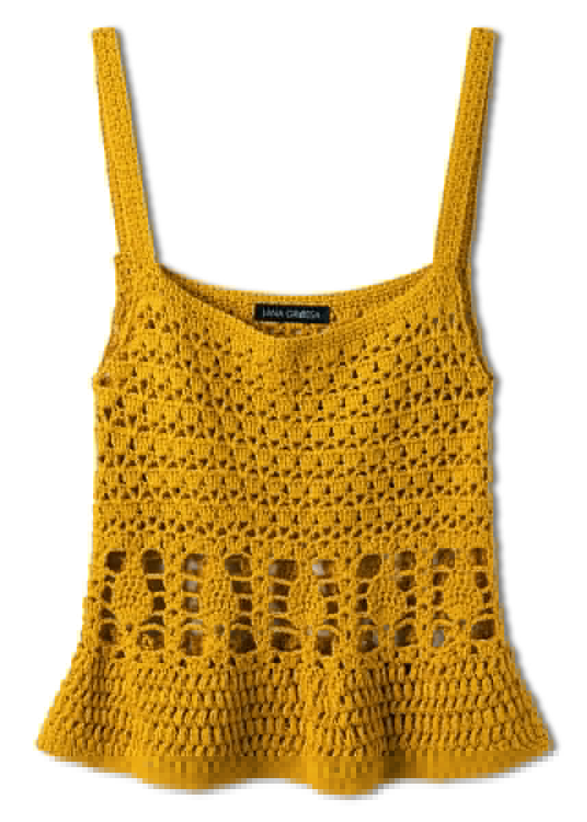 Lana Grossa-Qualität „Organico” (100 % (Bio) Baumwolle, LL = ca. 90 m/50 g): ca. 250 g Maisgelb (Fb. 119); 1 Wollhäkelnadel Nr. 4,5.