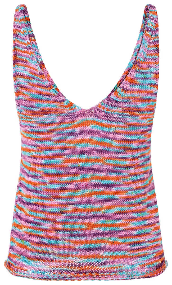 Das Farbenspiel dieses Tops erinnert an karibische Korallenriffs. Bildschön sind auch die betonten Abnahmen an den Hals- und Armausschnitten. Passender Shopper gefällig?