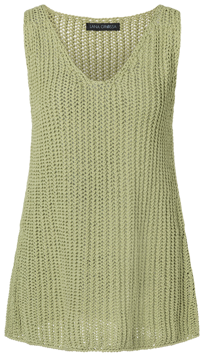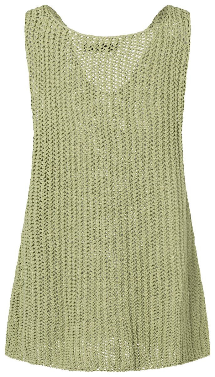 Beim schilfgrünen Long-Top aus nachhaltigem Schlauchbändchen-Garn sorgt ein einfaches Lochmuster für einen wunderbar fließenden Fall.