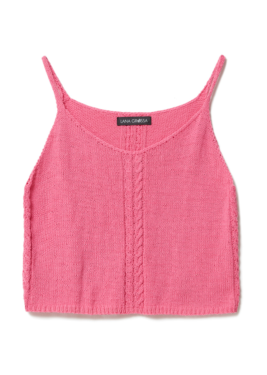 Schmale Zöpfe und angestrickte ICord-Träger – fertig ist das Spaghettiträger- Top mit besonderem Twist. Abgerundet wird das Modell von einem natürlich genoppten Seidengarn (neu).