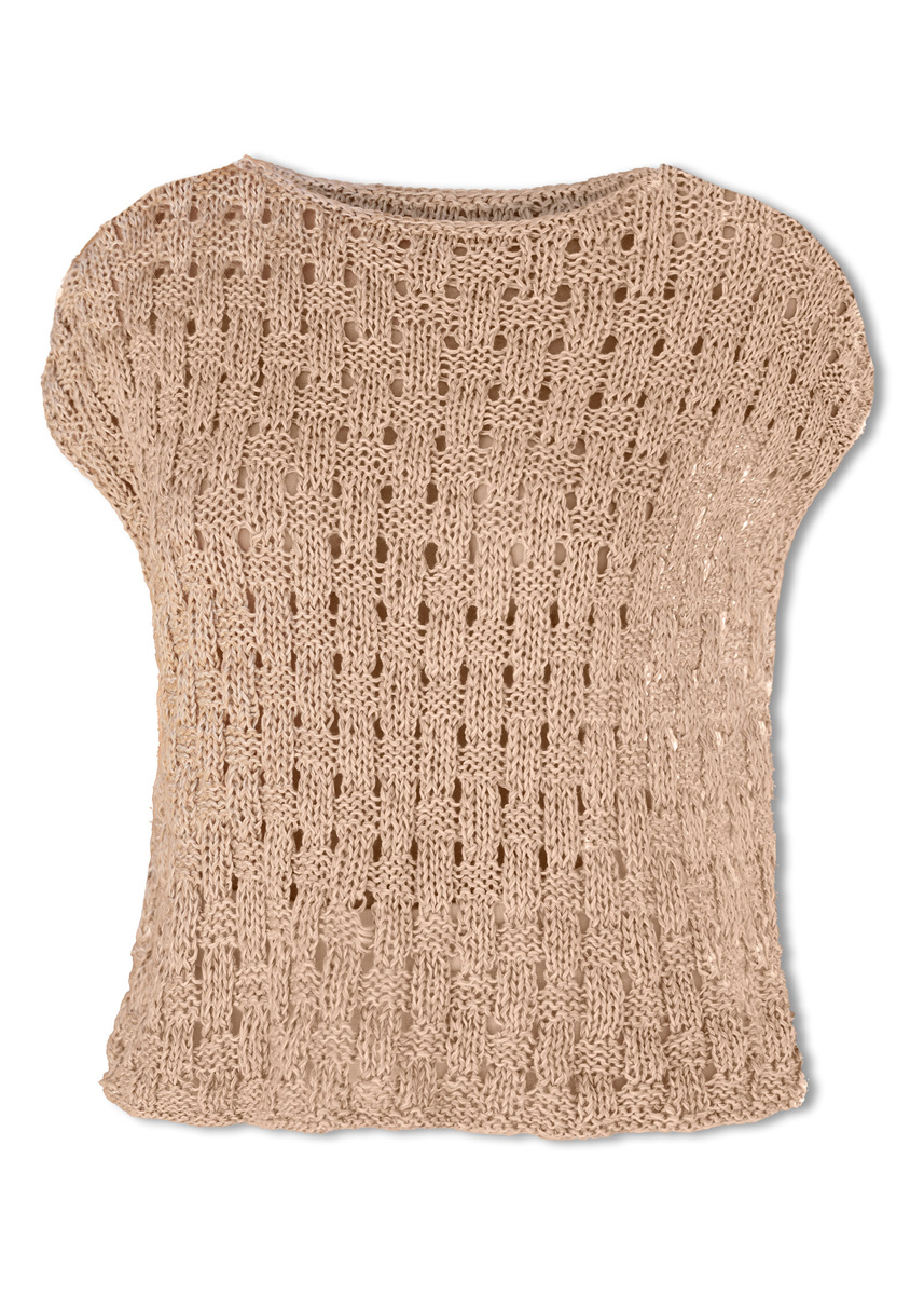 Lana Grossa Tencellino (51% Leinen, 49% Tencel, LL = ca 125 m/50 g), 250 (300 - 300 - 350) g in Hellblau (Fb 10) und 250 (300 - 300 - 350) g in Beige (Fb 3). Stricknd Nr. 6. Eine kurze Rundstricknd Nr. 5.