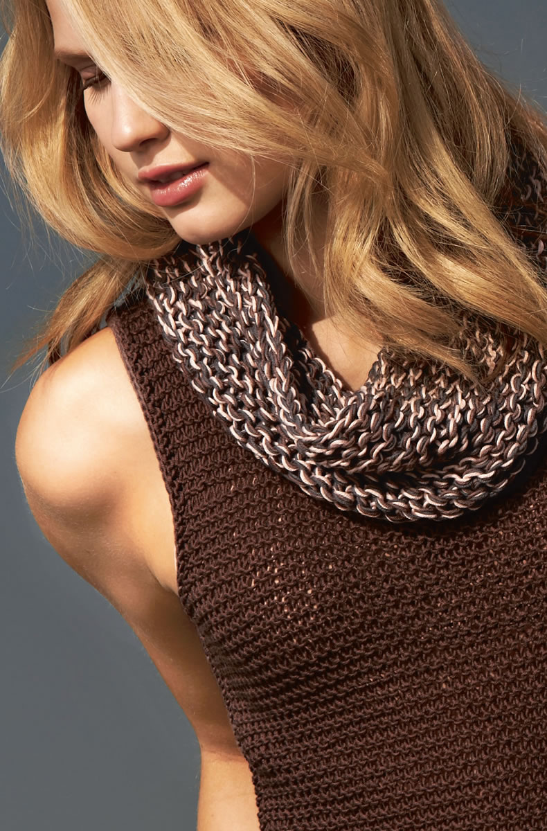 Lana Grossa-Qualität „Wakame” (75 % Baumwolle, 25 % Viskose, LL = ca. 125 m/50 g): ca. 200 (250 – 300) g Braun (Fb. 5); Stricknadeln Nr. 4, 1 Rundstricknadel Nr. 4, 60 cm lang.