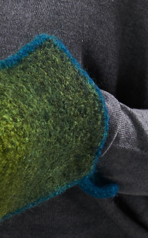 Lana Grossa Qualität „Feltro Rainbow” (100% Schurwolle, LL = 50 m/50 g), ca. 250 g Anthrazit/Grün/Gelbgrün (Fb 159) und „Feltro” (100% Schurwolle, LL = 50 m/50 g), ca. 50 g Petrolgrün (Fb 31), Stricknadeln Nr. 8, 1 Häkelnadel Nr. 8.