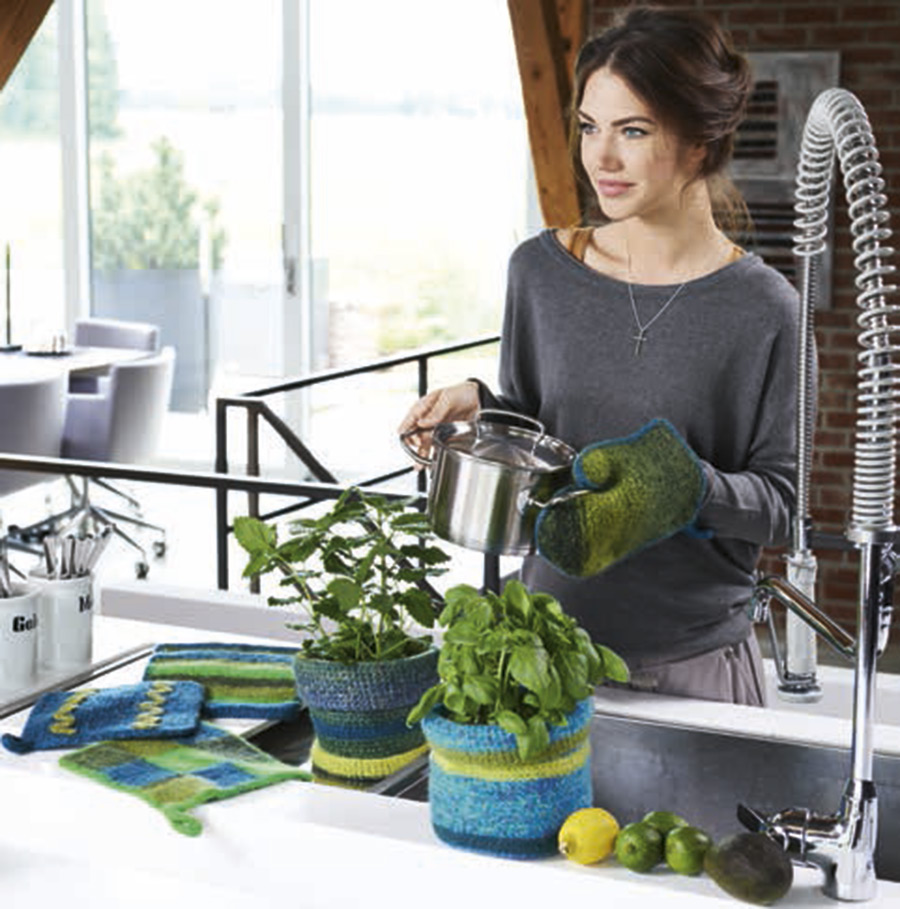 Lana Grossa Qualität „Feltro“ (100% Schurwolle, LL = 50 m/50 g), ca. 200 g Petrolgrün (Fb 31) und ca. 50 g Helloliv (Fb 21), 1 Häkelnadel Nr. 8, 1 Nähnadel und etwas Nähgarn in passender Farbe.
