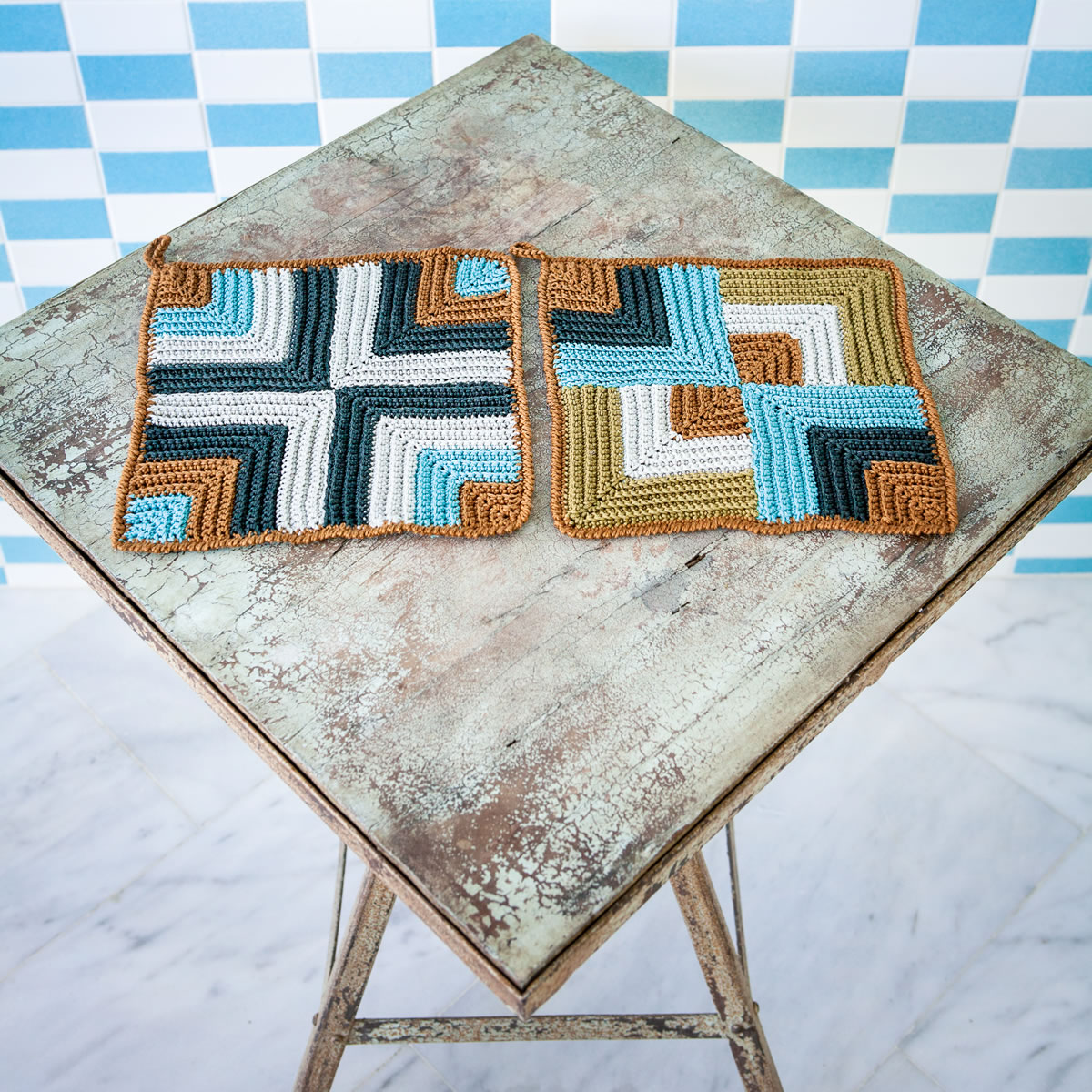 Lana Grossa-Qualität „Cotone” (100 % Baumwolle, gekämmt, gasiert, mercerisiert, LL = ca. 125 m/50 g): je ca. 50 g Oliv (Fb. 49), Hellgrau (Fb. 27), Braun (Fb. 37), helles Petrol (Fb. 43) und Dunkelpetrol (Fb. 47) – ist für beide Versionen ausreichend; 1 Wollhäkelnadel Nr. 3.