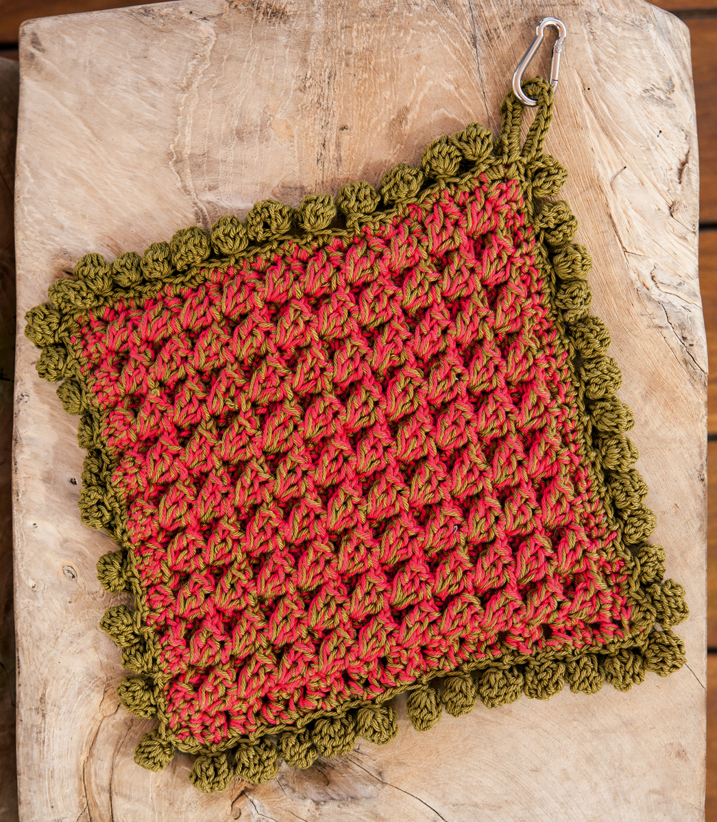 Lana Grossa-Qualität „Cotone“ (100 % Baumwolle, gekämmt, gasiert, mercerisiert, Lauflänge ca. 125 m/50 g): pro Modell: ca. 100 g Oliv (Fb. 49) und ca. 50 g Himbeer (Fb. 41); je 1 Wollhäkelnadel Nr. 3,5 und 4,5