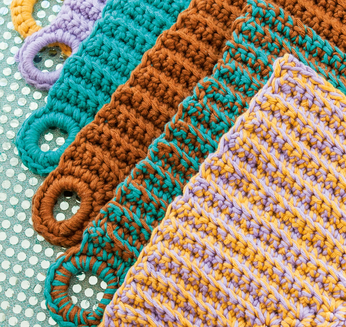 Lana Grossa-Qualität „Star” (100 % Baumwolle, LL = ca. 90 m/50 g) von hinten nach vorne: ca. 100 g Masigelb (Fb. 36), Lavendel (Fb. 41), Smaragd (Fb. 40) oder Braun (Fb. 39) und für die melierten Topflappen je 50 g Smaragd (Fb. 40) und Braun (Fb. 39) oder Masigelb (Fb. 36) und Lavendel (Fb. 41); 1 Wollhäkelnadel Nr. 4,5.
