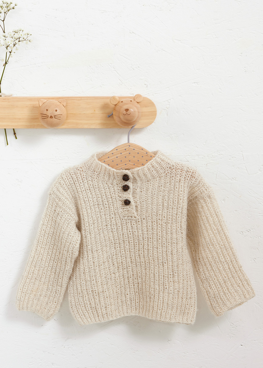 Lana Grossa Allora (76 % Baumwolle, 14 % Schurwolle (Merino superfine), 10 % Alpaka (Baby), Lauflänge = 300 m/50 g): 100 (100/150) g Perlweiß (Fb 13); Stricknadeln Nr. 3 und Nr. 3,5; Rundstricknadel Nr. 3,5; drei Knöpfe mit 10 mm Ø.