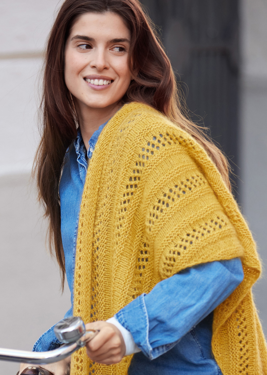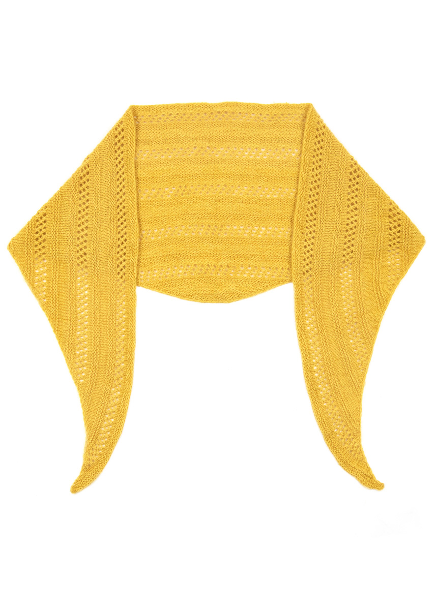 Lana Grossa Cashmere Love (50% Kaschmir, 50% Baumwolle, Lauflänge 112 m/25 g), 100 g Gelb (Fb 9) und Lana Grossa Silkhair (70% Mohair (Superkid), 30% Seide, Lauflänge 210 m/25 g), 75 g Curry (Fb 160); 1 Rundstricknadel Nr. 4,5, 120 cm lang.