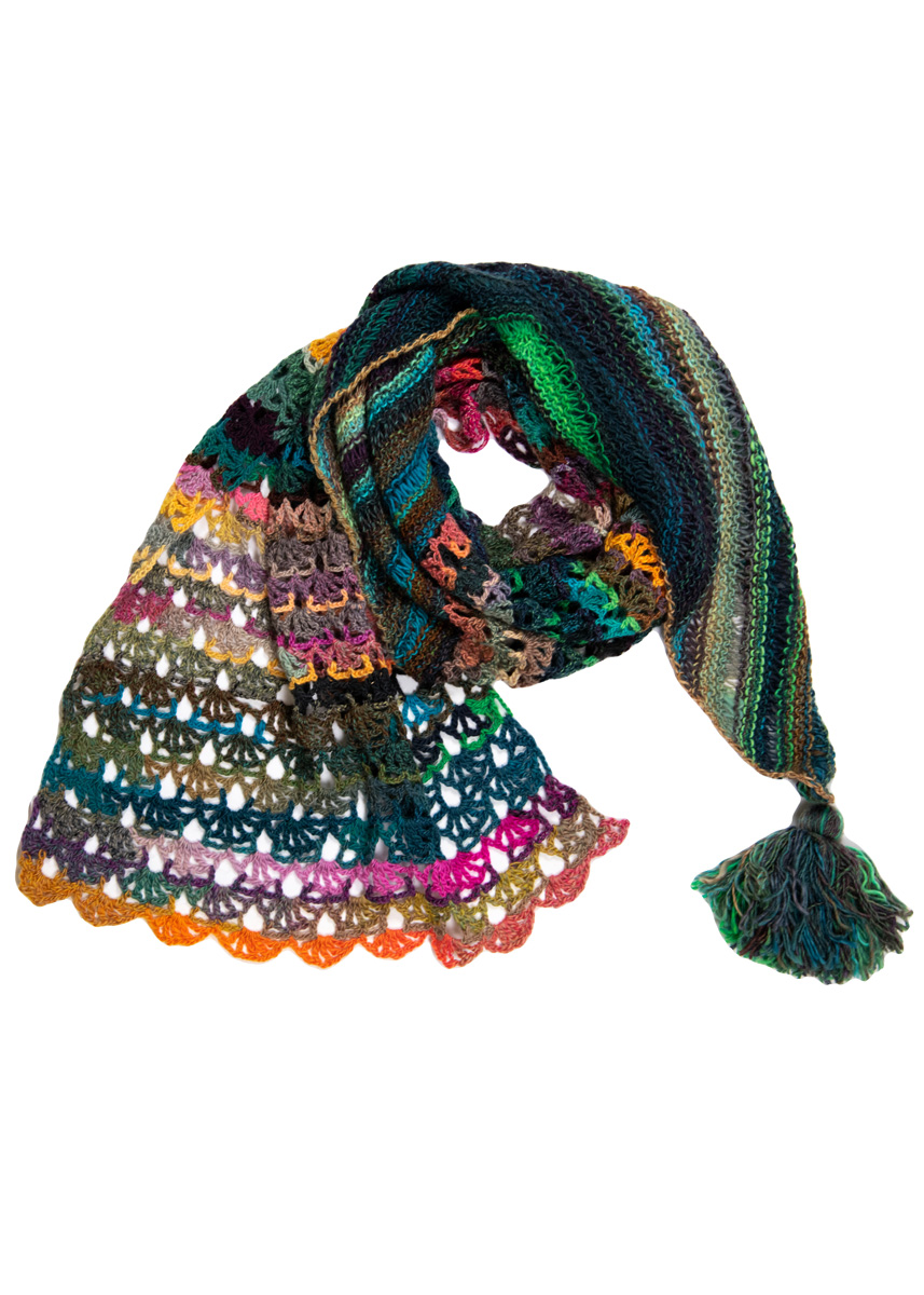 Lana Grossa Colorissimo (100% Schurwolle Merino extrafein, Lauflänge 300 m/100 g), 200g Beige/ Türkis/Hellgrün/Petrol/Camel/Rotbraun (Fb 4) und 100 g Senf/Petrol/ Lachs/Pink/Orchidee/Mint/Dunkelgrün (Fb 10); Stricknadeln Nr. 6 und 1 Häkelnadel Nr. 4,5.