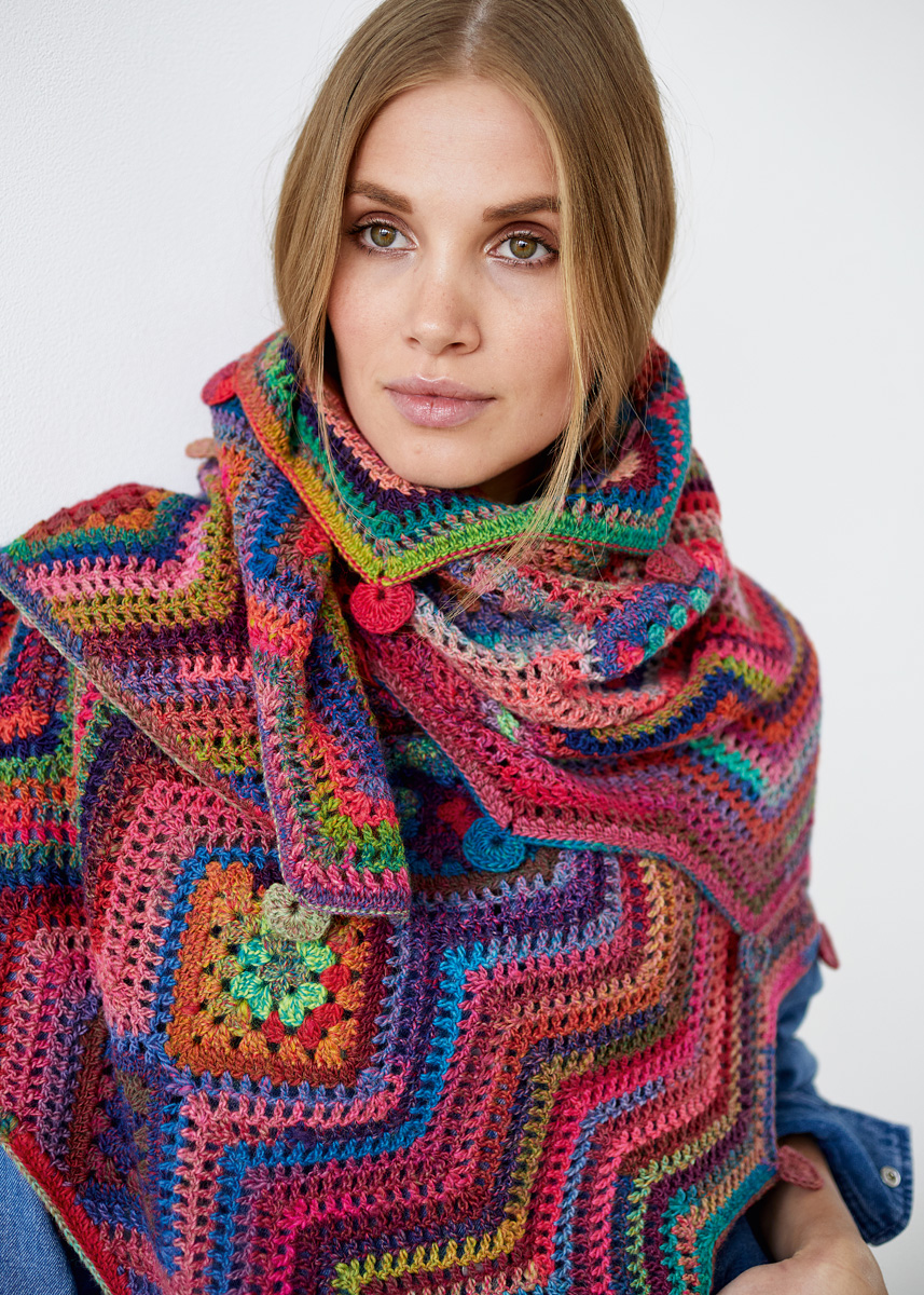 Lana Grossa Colorissimo (100% Schurwolle Merino extrafein, Lauflänge 300 m/100 g), 500 g Rost/Petrol/ Lachsrot/Grün/Rot/Weinrot/Himbeer (Fb 7); 1 Häkelnadel Nr. 4,5.