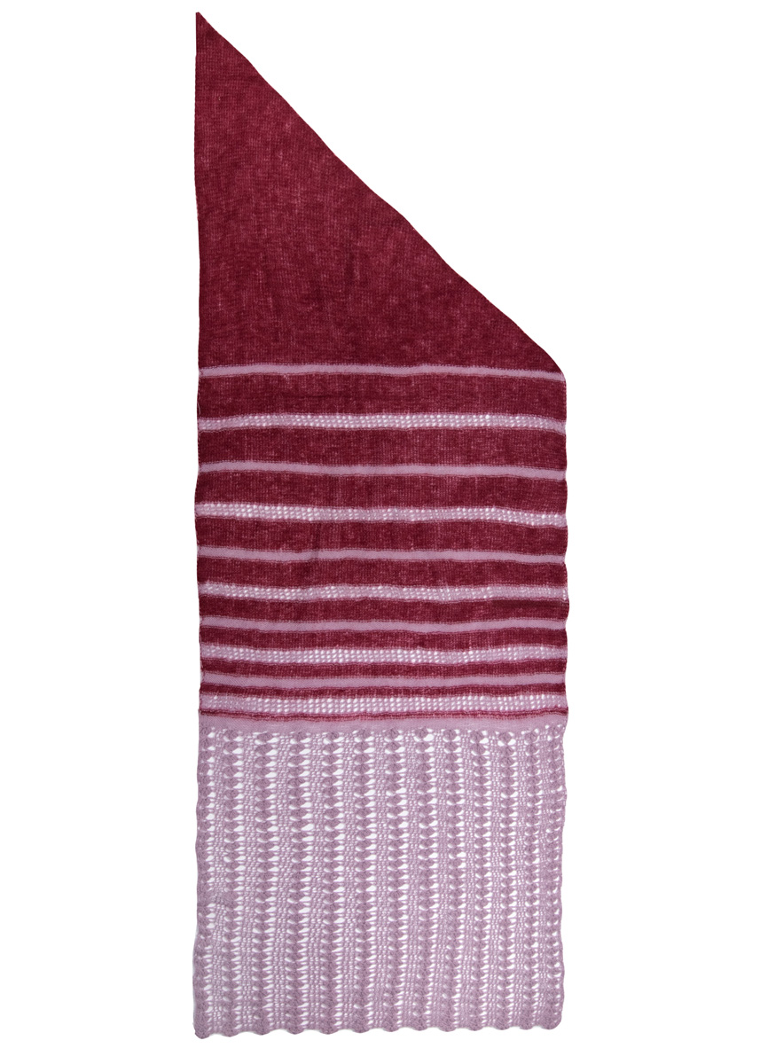 Lana Grossa Cool Wool Lace (100% Schurwolle Merino extrafein, Lauflänge 400 m/50 g), 100 g Flieder (Fb 15) und Silkhair (70% Mohair, 30% Seide, Lauflänge 210 m/25 g), 50 g Bordeaux (Fb 113); Stricknadeln Nr. 5 und 1 Häkelnadel Nr. 3,5.