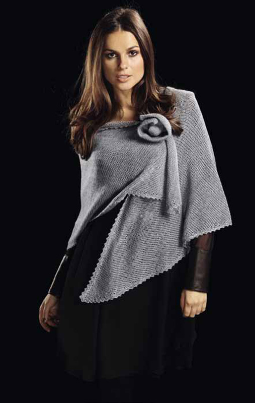 Lana Grossa- Qualität „Lace Lux“ (67 % Viskose Mikrofaser, 33 % Schurwolle Merino extrafein, Lauflänge ca. 310 m/50 g): ca. 150 g Silbergrau Fb. 11; Stricknadeln Nr. 3,5 und 5,5, je 1 Rundstricknadel Nr. 5,5, 80 und 100 cm lang, 1 Wollhäkelnadel Nr. 3,5; 1 große Sicherheitsnadel